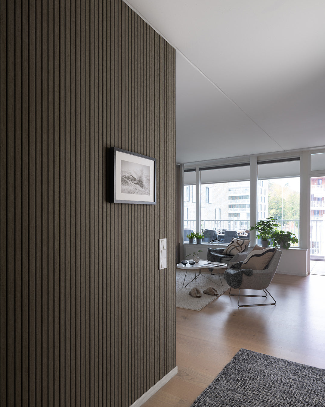 Bryt av den jordnära paletten med ebernholts mörka kontraster. Träpanelens breda ribbor skapar blickfång till din inredning och bjuder in till en vacker och välbalanserad atmosfär. Träribborna är 4,7cm breda med 2cm mellanrum.