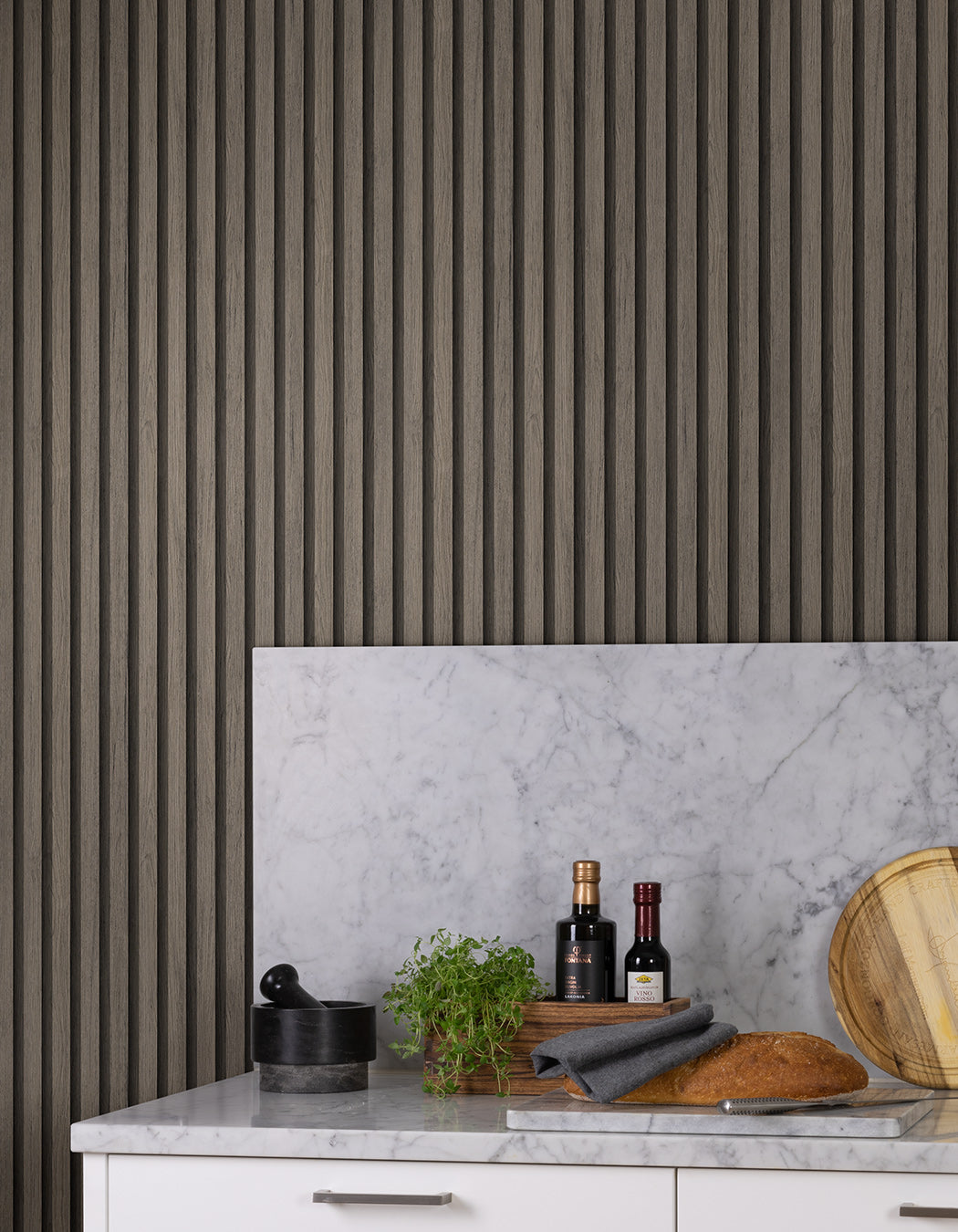Vackra smala trä ribbor i en mörk ebenholts utgör den perfekta tapeten för effektfulla fondväggar, eller ombonade rum där den får ta plats på alla väggar. Aldrig har det varit enklare att få till favoriten med träpanel. Träribborna är 2,5cm breda med 1,5cm mellanrum.