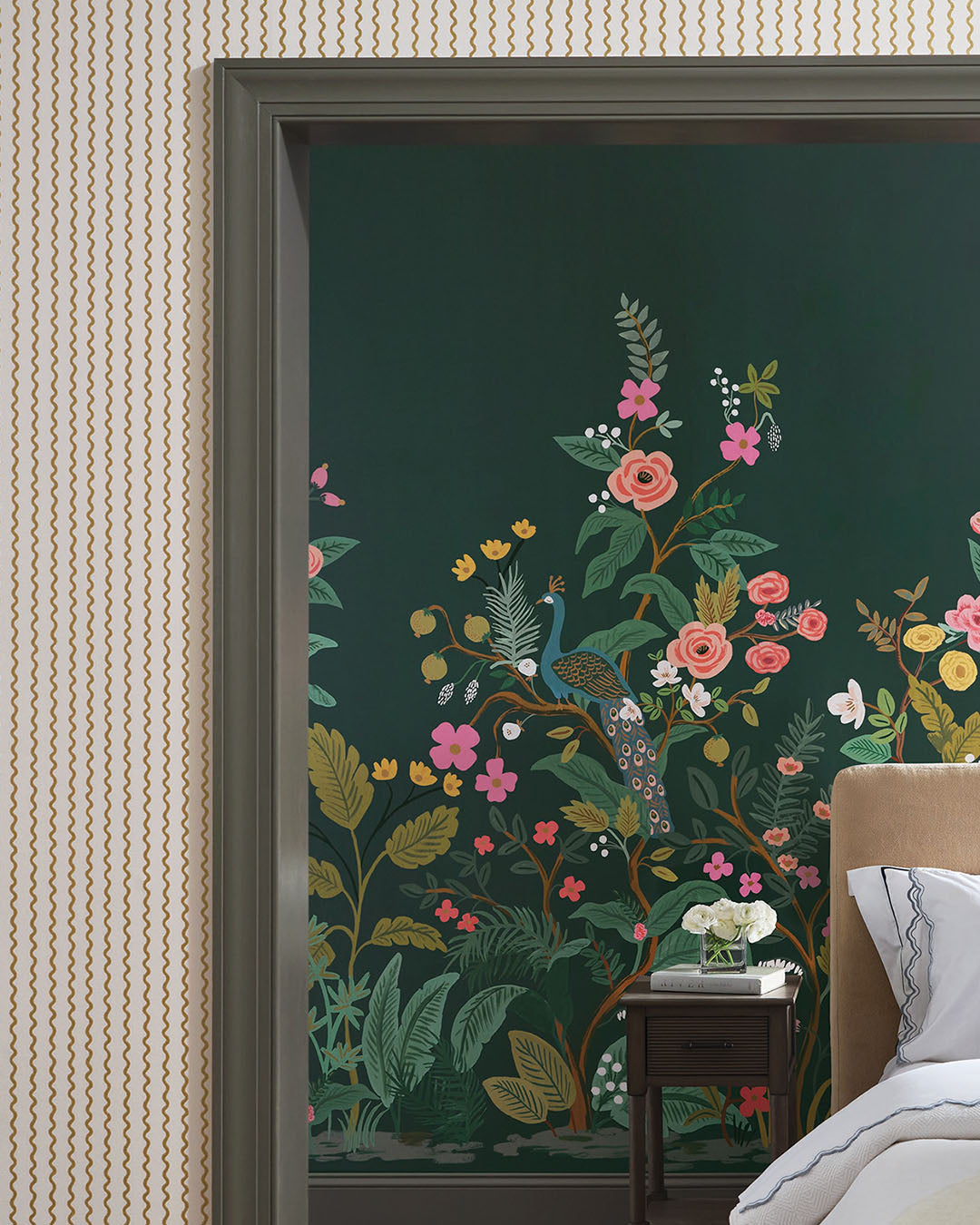 Tapet Rickrack är en randig tapet uppbyggd av smala, vågiga linjer som löper lodrätt över väggen i jämnt avstånd, likt vågiga rick rack-band. Mönstret ger en mjuk, rytmisk rörelse utan att bli oroligt och skapar ett handritat, textilt intryck. Botten är vit och linjerna går i guldmetallic. Helhetsintrycket är ljust, lekfullt och luftigt med en modern men vänlig känsla. En enkel, lättplacerad rand som ger rummet höjd och ett subtilt grafiskt uttryck.