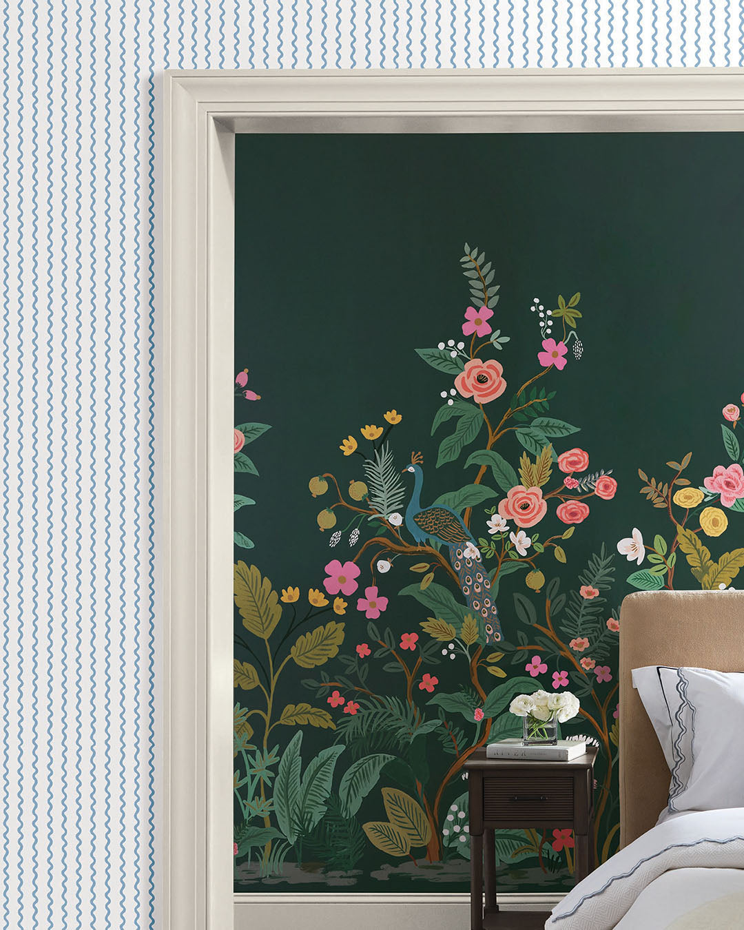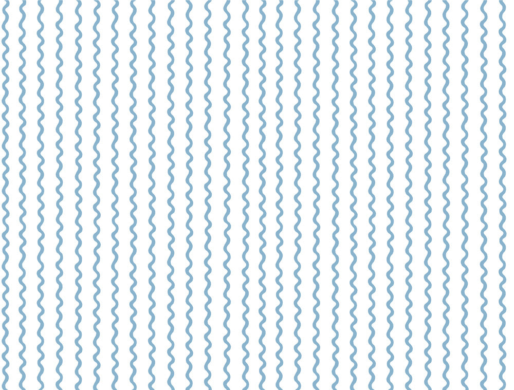 Tapet Rickrack är en randig tapet uppbyggd av smala, vågiga linjer som löper lodrätt över väggen i jämnt avstånd, likt rickrack-band. Mönstret ger en mjuk, rytmisk rörelse och ett handritat, textilt intryck. Botten är vit och linjerna går i behagligt blått. Helhetsintrycket är ljust, fräscht och svalt. En enkel, lättplacerad rand som ger rummet höjd och ett subtilt grafiskt uttryck.