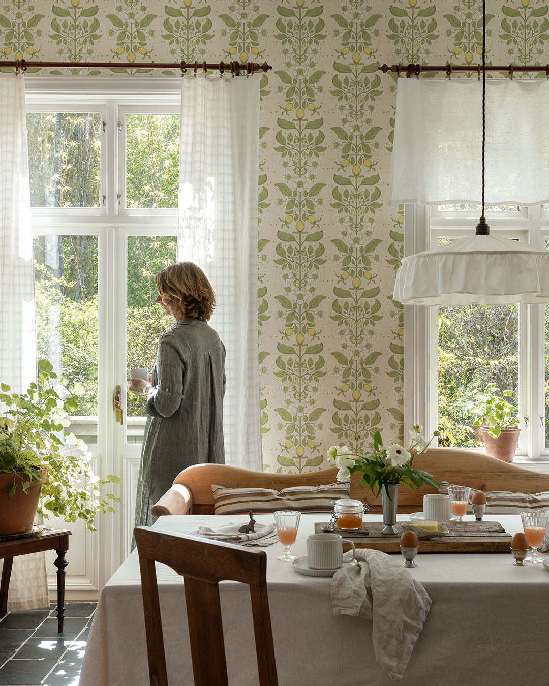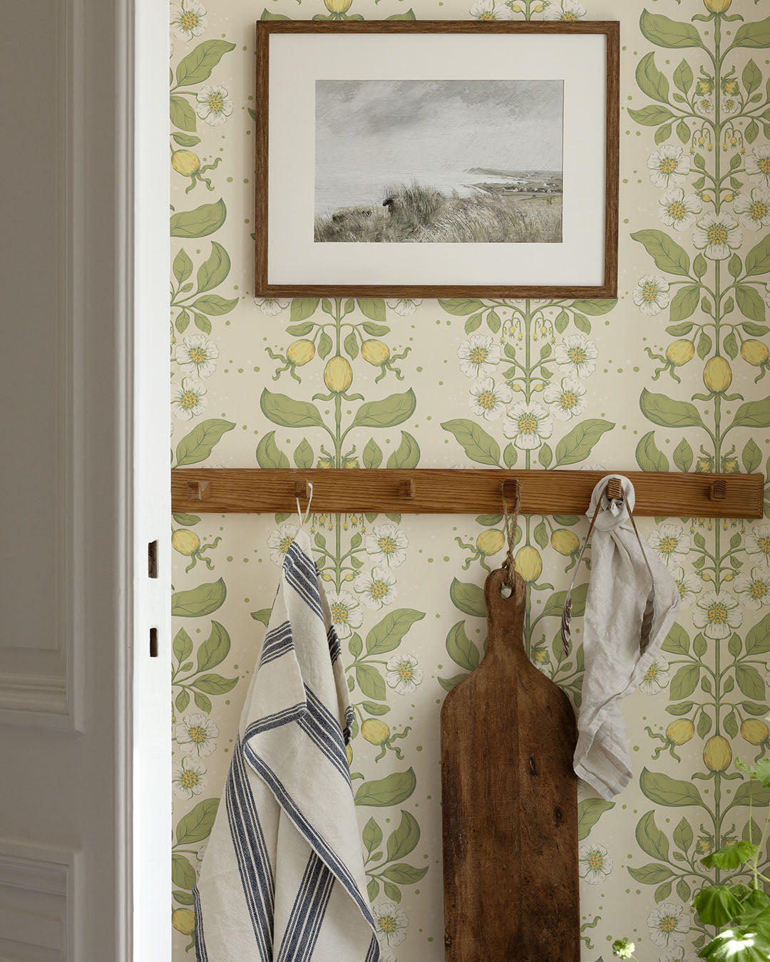 I tapeten Rosa klättrar vildrosen längs väggen där den varmvita botten, gröna blad, blommor och nypon i gult och vitt skapar en varm och ombonad känsla i rummet. En tapet som ger rummet energi på ett rogivande sätt och binder samman växtligheten mellan ute och inne. En tapet som varsamt bevarar de historier som pågår och som sömlöst avlöser varandra i ett hem.