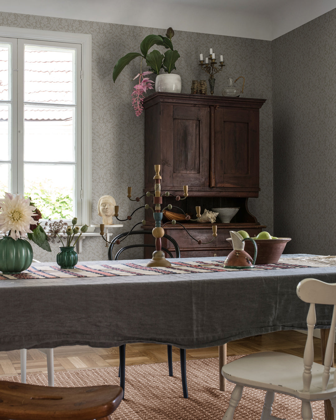 Mörkgrå medaljongtapet skapar elegans till dina väggar. Ett klassiskt inrett vardagsrum passar lika bra för detta mönster som ett lyxigt sovrum. Mönstret Rosali kommer i 5 färgställningar och är designat av Hanna Wendelbo.