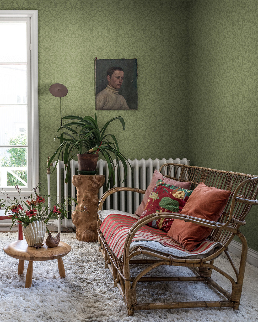 De stora konstnärligt arrangerade och sammanflätade bladmönstret lyfter denna non-woven tapet till ett riktigt konstverk. En kombination av två gröna nyanser skapar en interessant och sofistikerad medaljongtapet som denna.