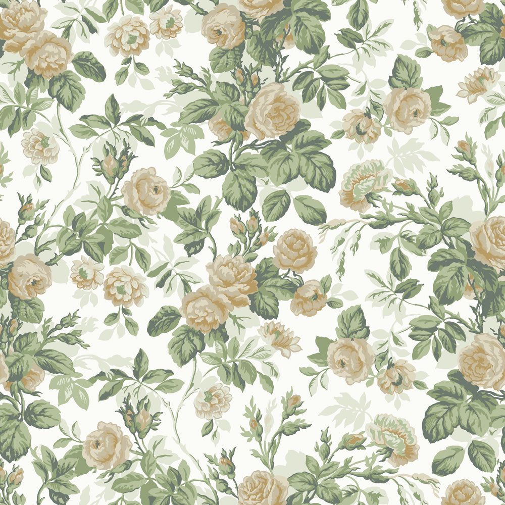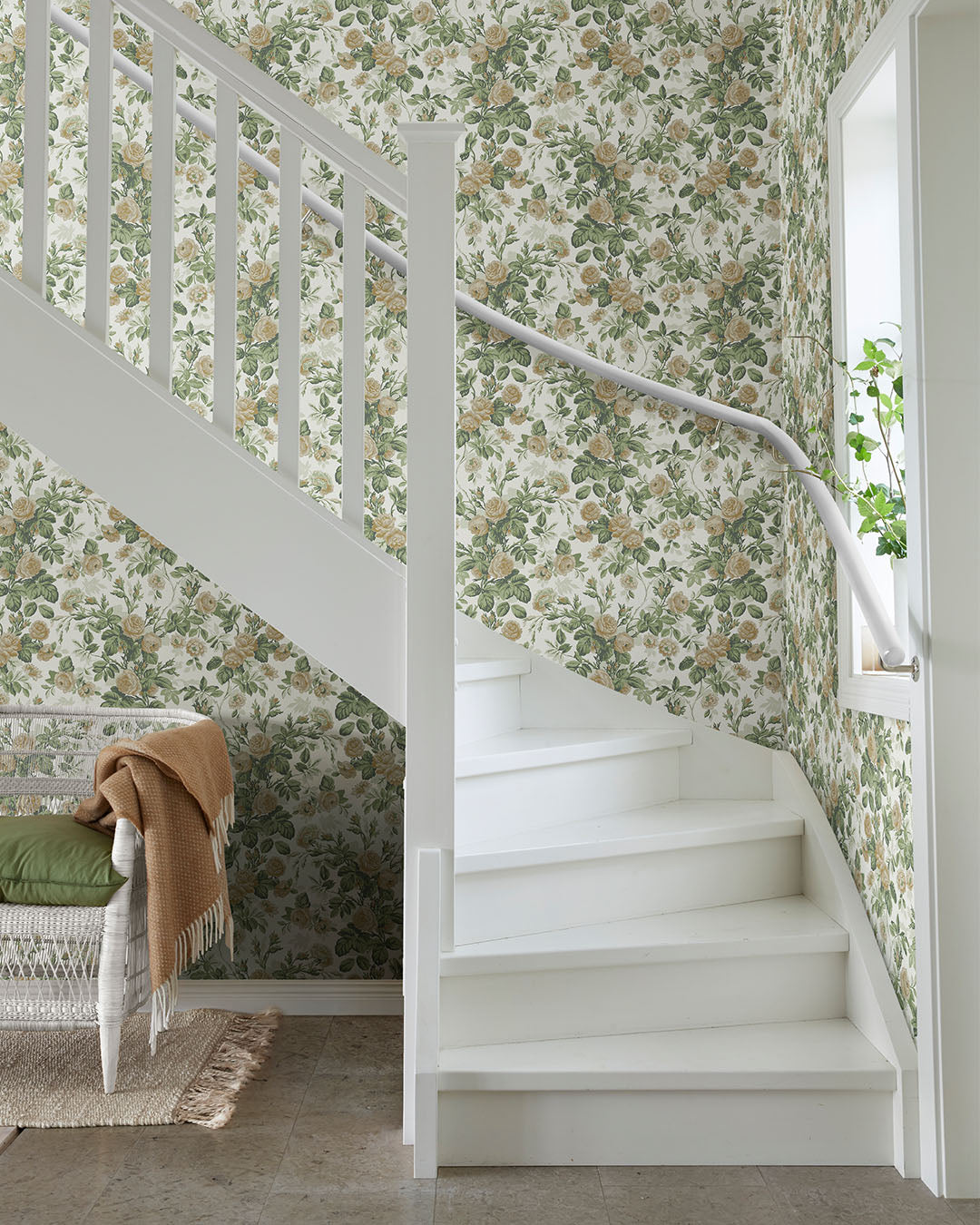 Tapet Rosdalen sprider en romantisk värme i hemmet med sina pampiga rosor i mörk champagne, gröna blad och kvistar på en vit botten. Det blir ombonat och livfullt när rosorna tar sin plats på väggen och gör rummet till en blomstrande oas.