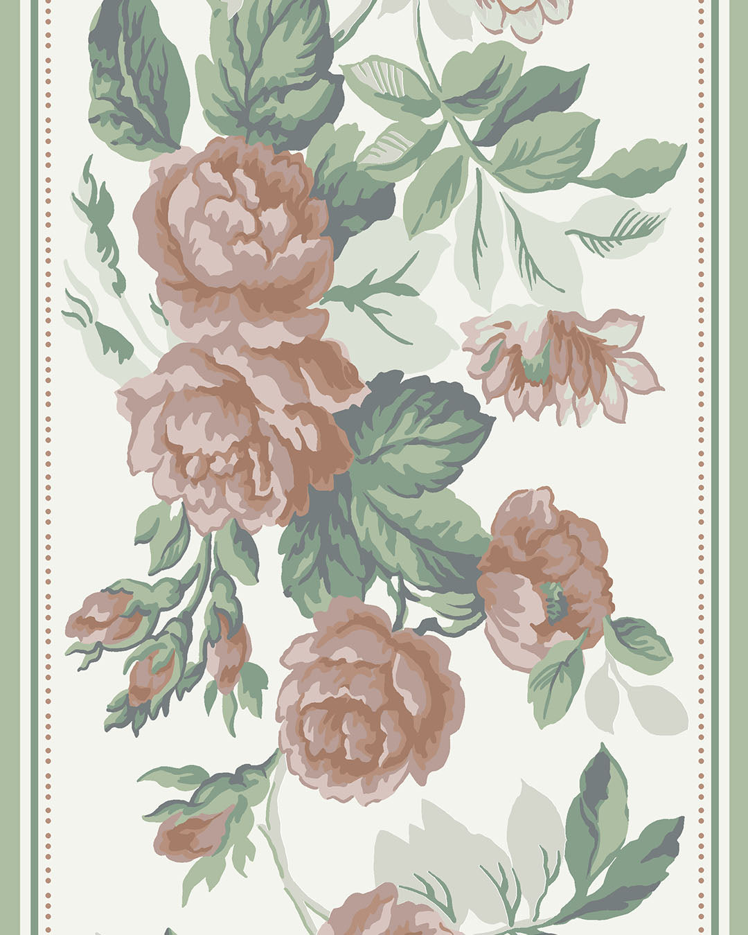Rosdalen bård låter rosbuskens kvistar växa och förgrena sig på den yta som en bård tillåter. Bården som har en vit botten med prunkande rosor i milda nyanser av grönt, rosa och terrakotta tillför en romantisk detalj till rummets väggar. Maximera romantiken genom att kombinera Rosdalen bård med Rosdalen tapet eller ge rummet en mer lågmäld romantisk känsla genom att kombinera Rosdalen bård med Rosemarie tapet eller med enfärgad Jute tapet.