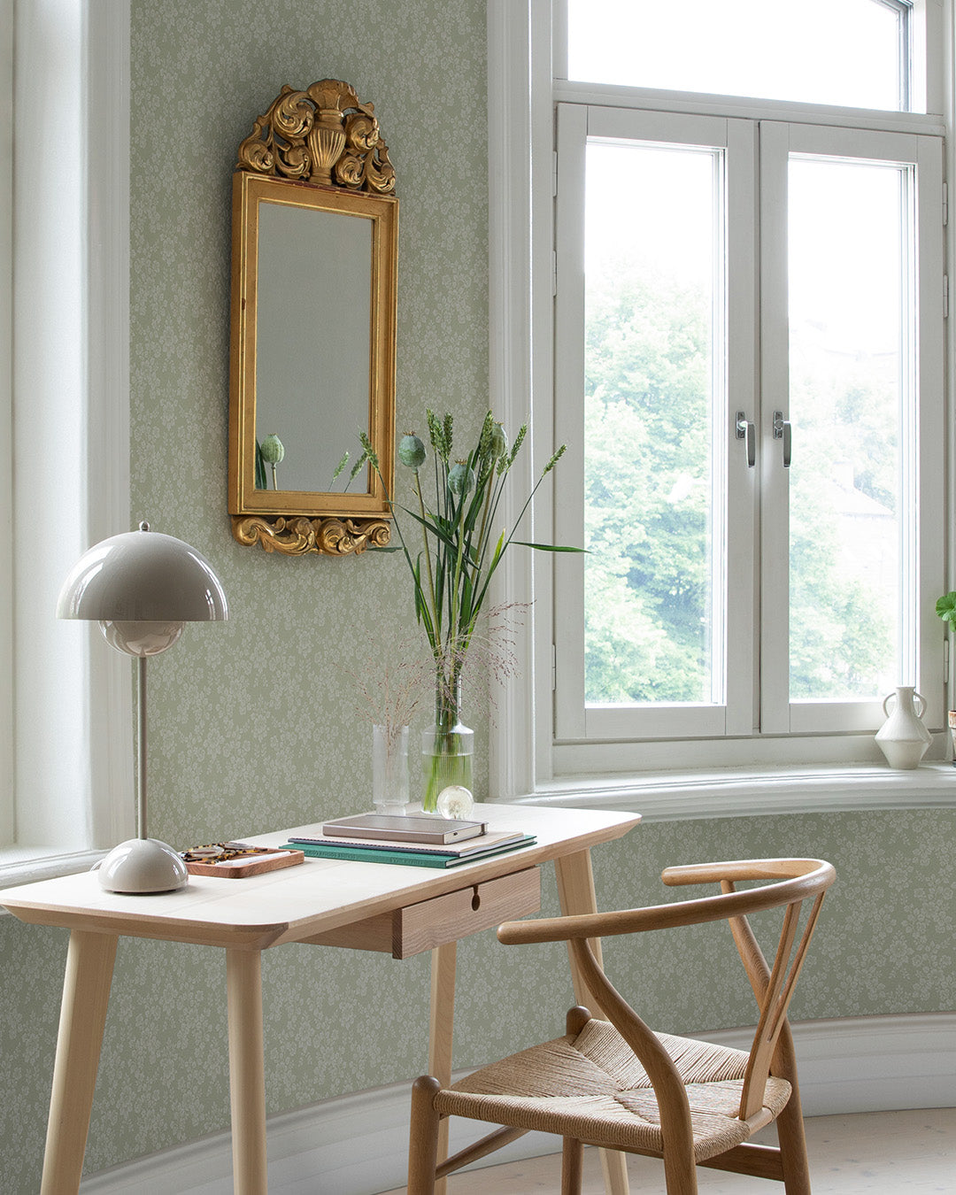 I ett klättrande medaljongmönster i tapeten Rosita vävs varje blomstrande rosranka med tillhörande knoppar varsamt samman och skaper en atmosfär av stillhet och ro. Denna milda gröna ton i ton färgställning utstrålar en tidlös elegans och ger rummet en diskret touch av romantik.