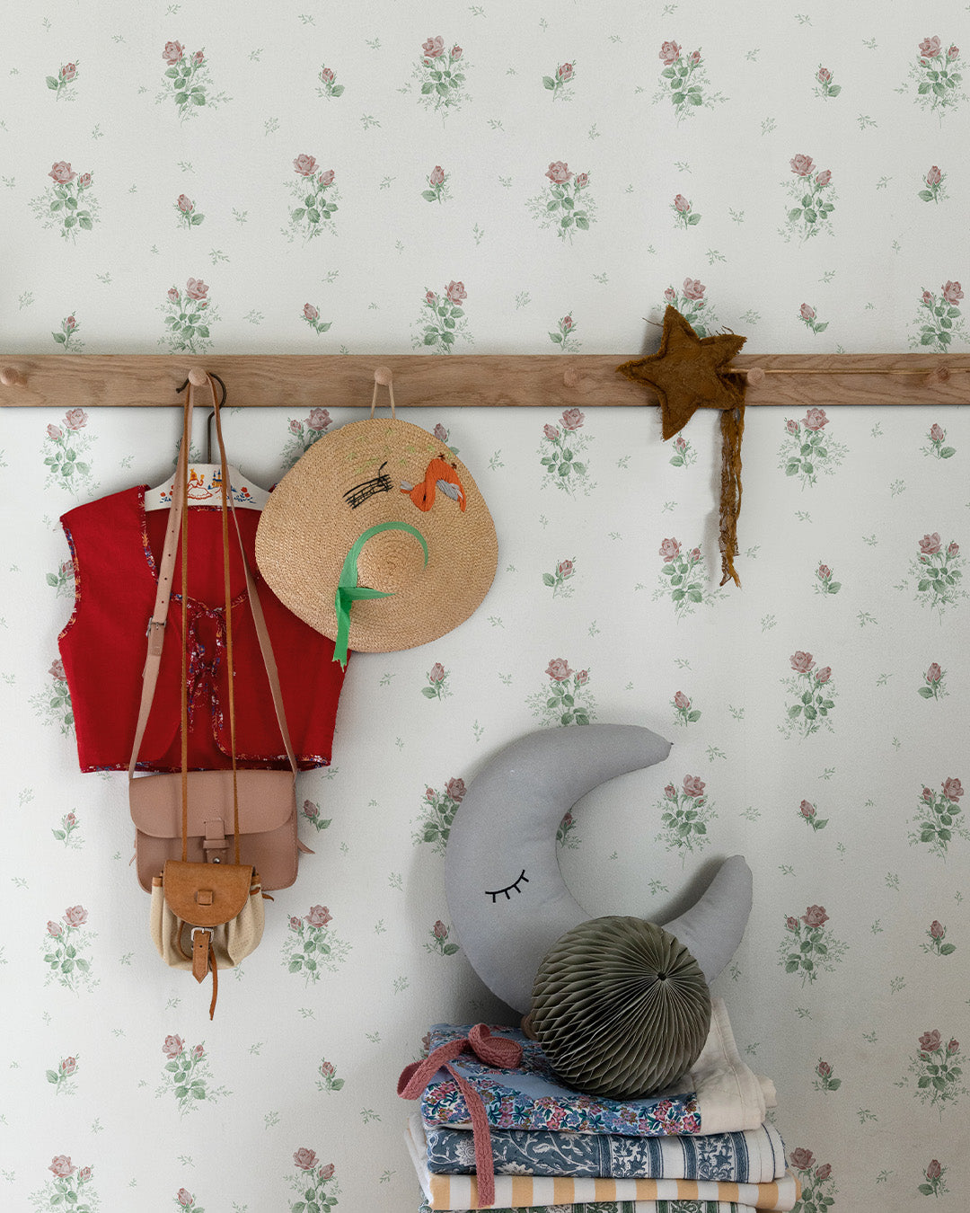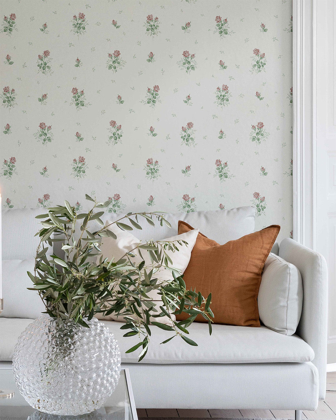Små sköra rosenknoppar klär varsamt väggen med tapeten Rosmarie. Med vit botten och rosaröda blommor och gröna blad skapar en härligt gamaldags romantisk känsla i rummet.