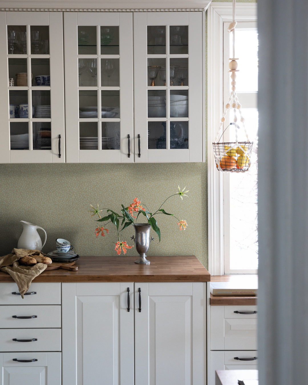 Tapet med en harmonisk grönbeige botten som smyckas av handritade blad i en grågrön nyans. Småmönstrade tapeter skapar väggar fulla av karaktär, väggarna tillför helt plötsligt liv och rörelse till rummet även de mest subtila mönstret tänkbart. Bläddra bland 5 olika kulörer.