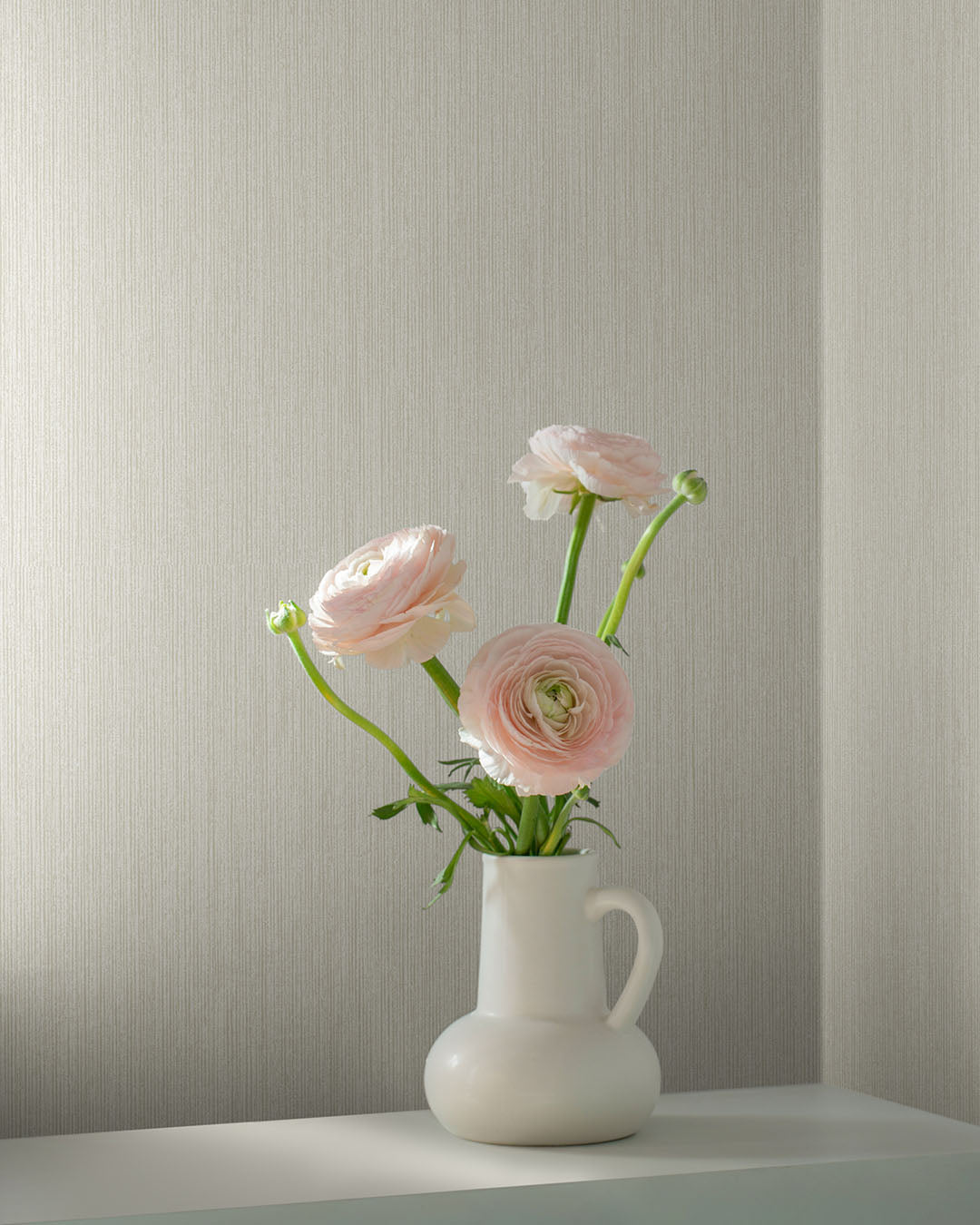 Tapeten Salt i ljusbeige nyans bidrar med en varm känsla i rummet. Den enfärgade tapeten har en trådliknande struktur som ger liv åt väggarna. Passar fint som en mjuk bas på rummets alla väggar eller som ett enfärgat komplement till en mer mönstrad tapet.