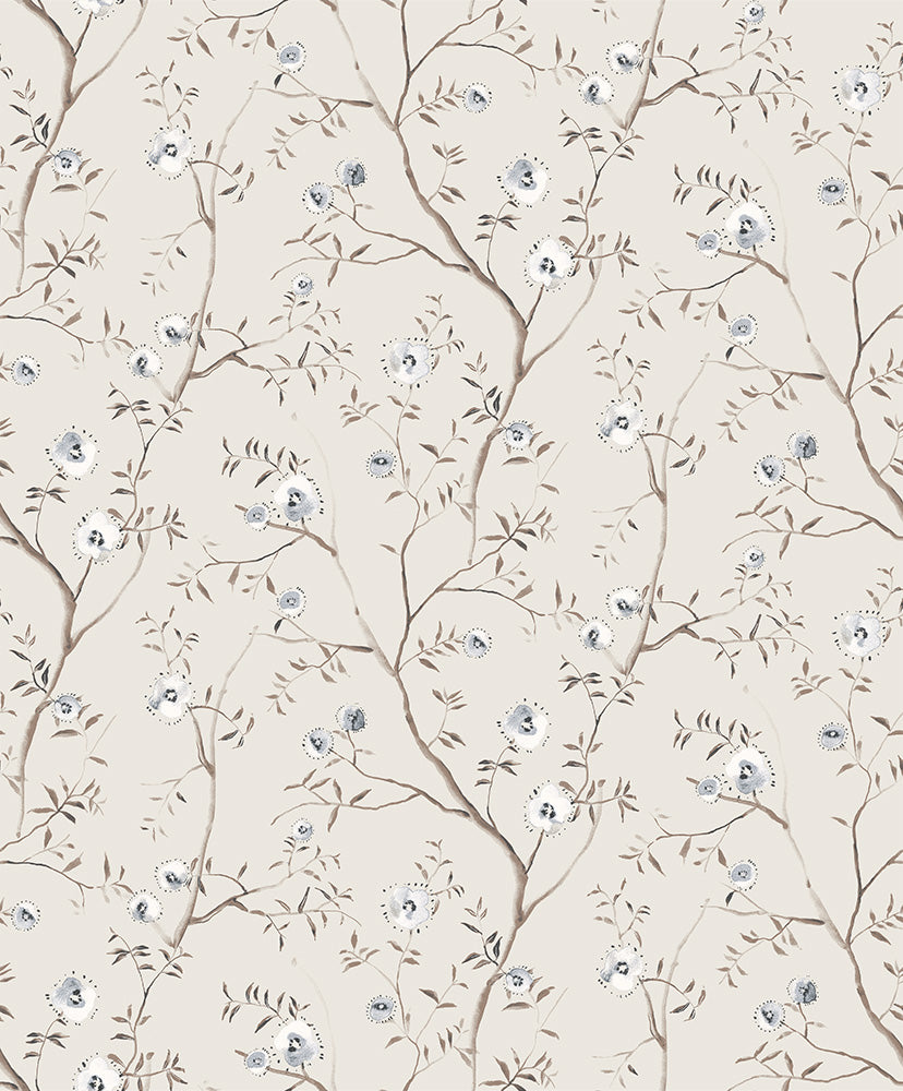 Handmålade små, skimrigt, silvriga blommor mot en perfekt ljusbeige botten blir en vacker detalj i hemmet. Tapetens behagligt slingrande grenar med en försiktigt blekt effekt passar perfekt in bland sovrummet ljusa interiör.