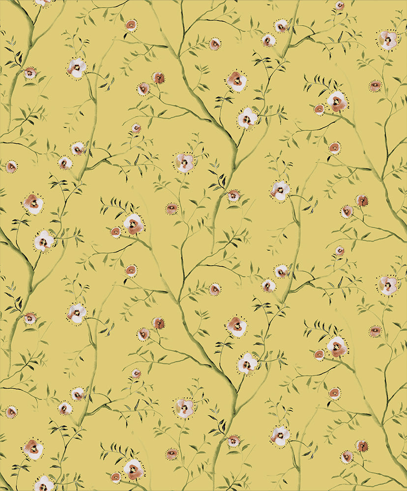 Skapa din egen oas av blomstrande tapet. Sari Oasis gulgröna botten täcks av blommor i vitt och skimrande orange som slingrigt klättrar sig upp längs väggarna.