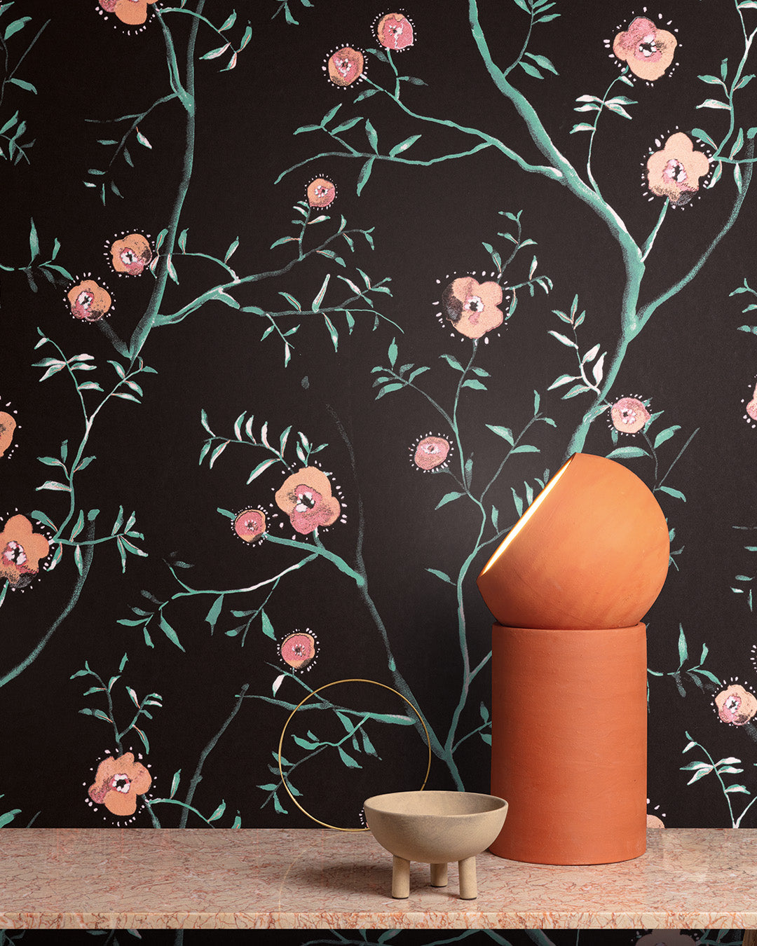 Sari Teal, ett mönster av handmålade blommor skapar en stark men harmonisk känsla. Små oskyldiga blommor i ett korallfärgat skimmer bland slingrigt klättrande bladverk ger en härlig dynamik i kontrasten mellan det mjuka och hårda svarta.