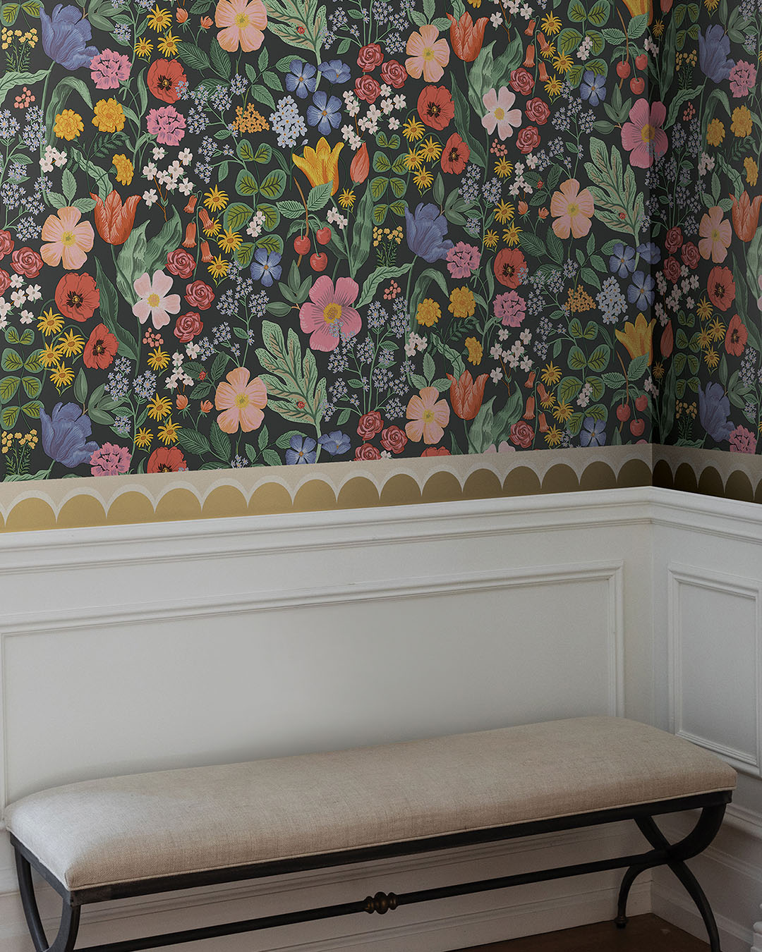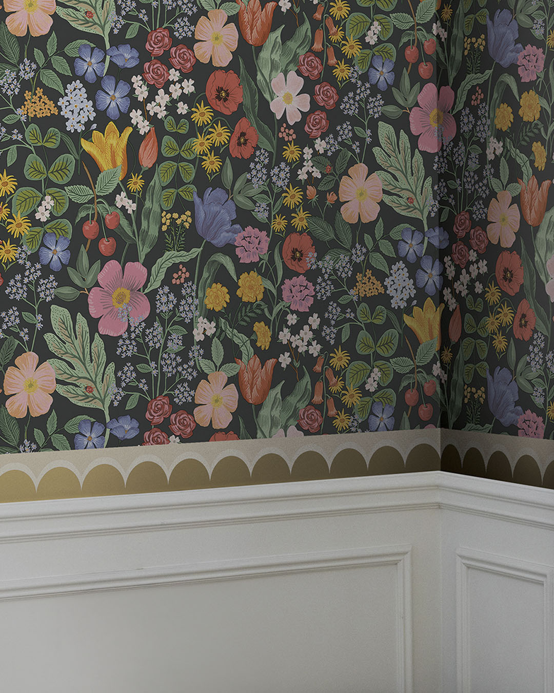 Scallop Trim är en grafisk bård med mjuk, rundade bågar. Formen delas av av en smal, ljus linje som förstärker den handmålade känslan. Bårdens ena kantfält är beige och det bågformade mönstret är guldmetallic. En enkel, lättplacerad bård som ramar in dörrar, fönster eller väggfält och ger rummet en varm, vänlig accent utan att ta över.