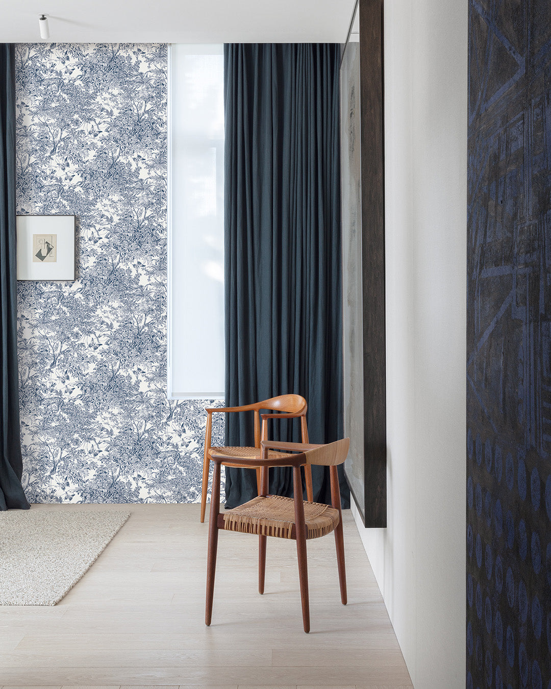 Tapeten Scene Ink är en modern tolkning av klassiskt toile-mönster med inspiration från exotiska djungelscener. De detaljrika handritade motiven av leoparder, fjärilar och tät växtlighet framträder i djupt bläckblå ton mot en klar vit bakgrund.