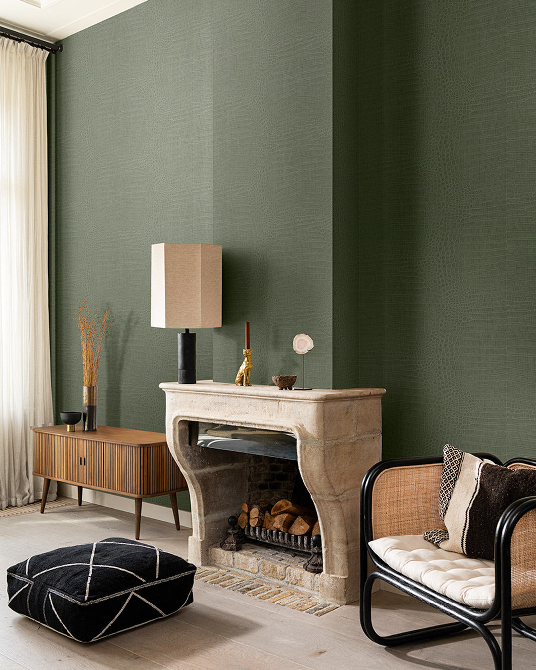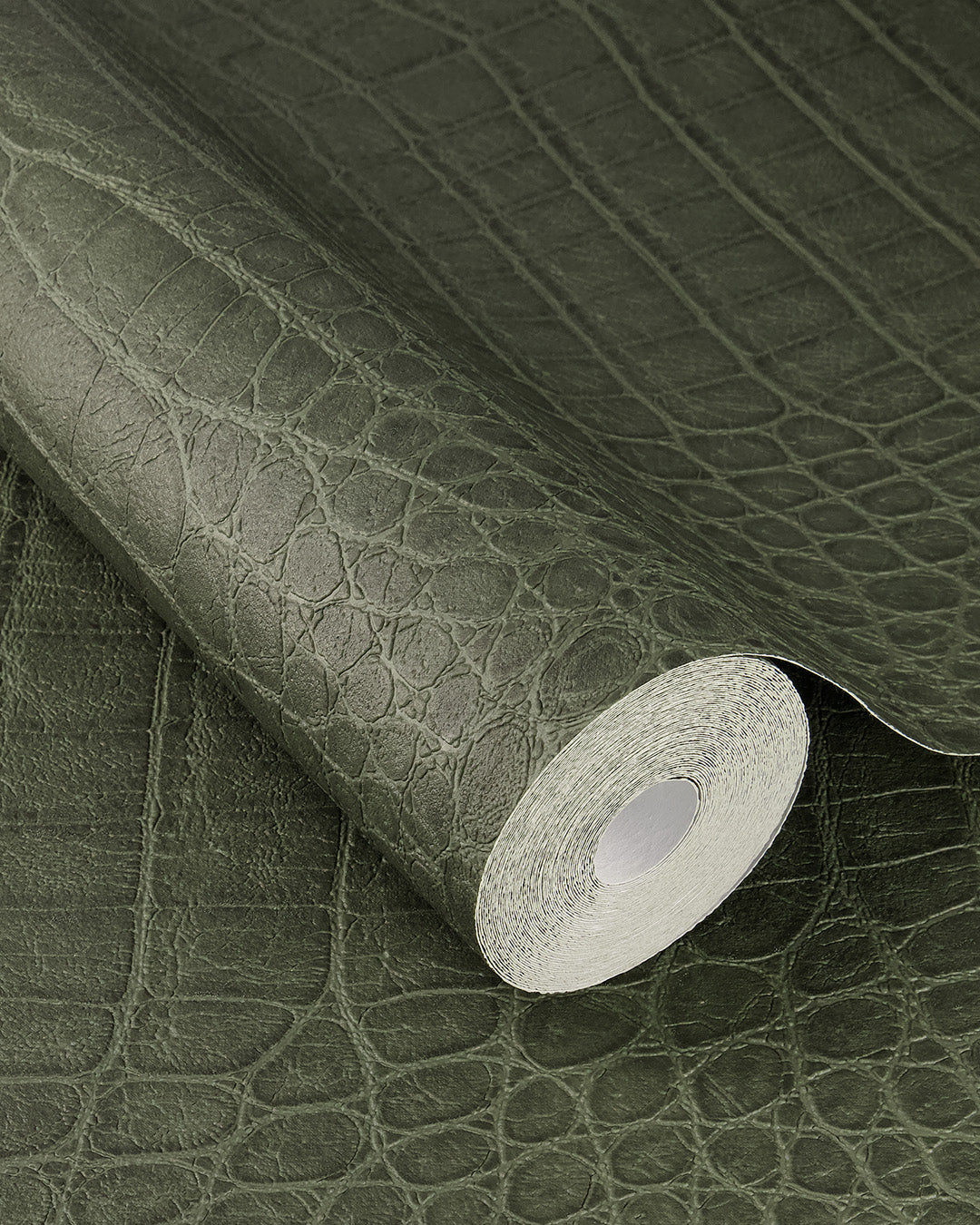 Ett fantastiskt krokodillädertryck som pryder dina väggar. Den mörkt gröna nyansen i varm underton omfamnar rummet med sitt stämningsfulla uttryck. Tapetens unika mönster och perfekta imitation ger den dina väggar en individuell och exotisk touch.