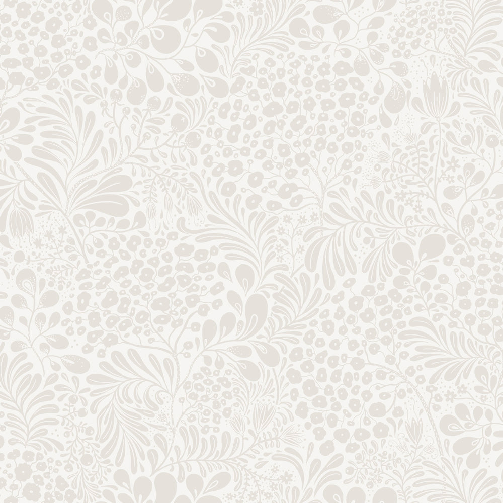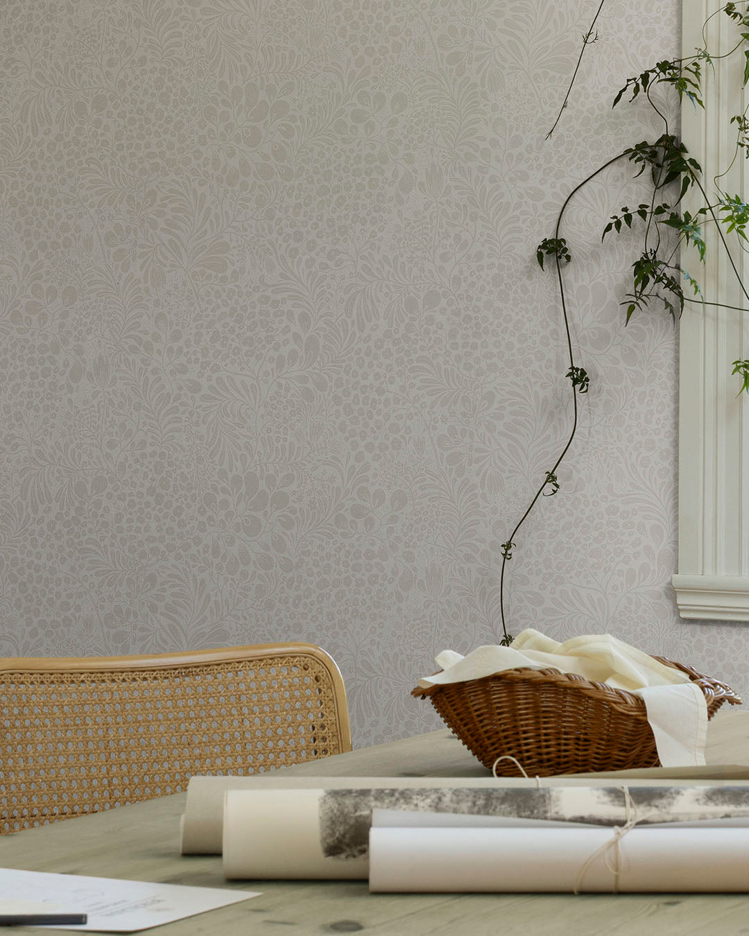 Tapeten Siv med vit botten och ett slingrande intrikat mönster av blommor och blad i ljusgrått är ett fint komplement till tapeter med mer mönster och färg. Den är enkel men livfull och blir en behgalig tapet som fungerar fint som en övergång mellan olika tapeter i olika rum.