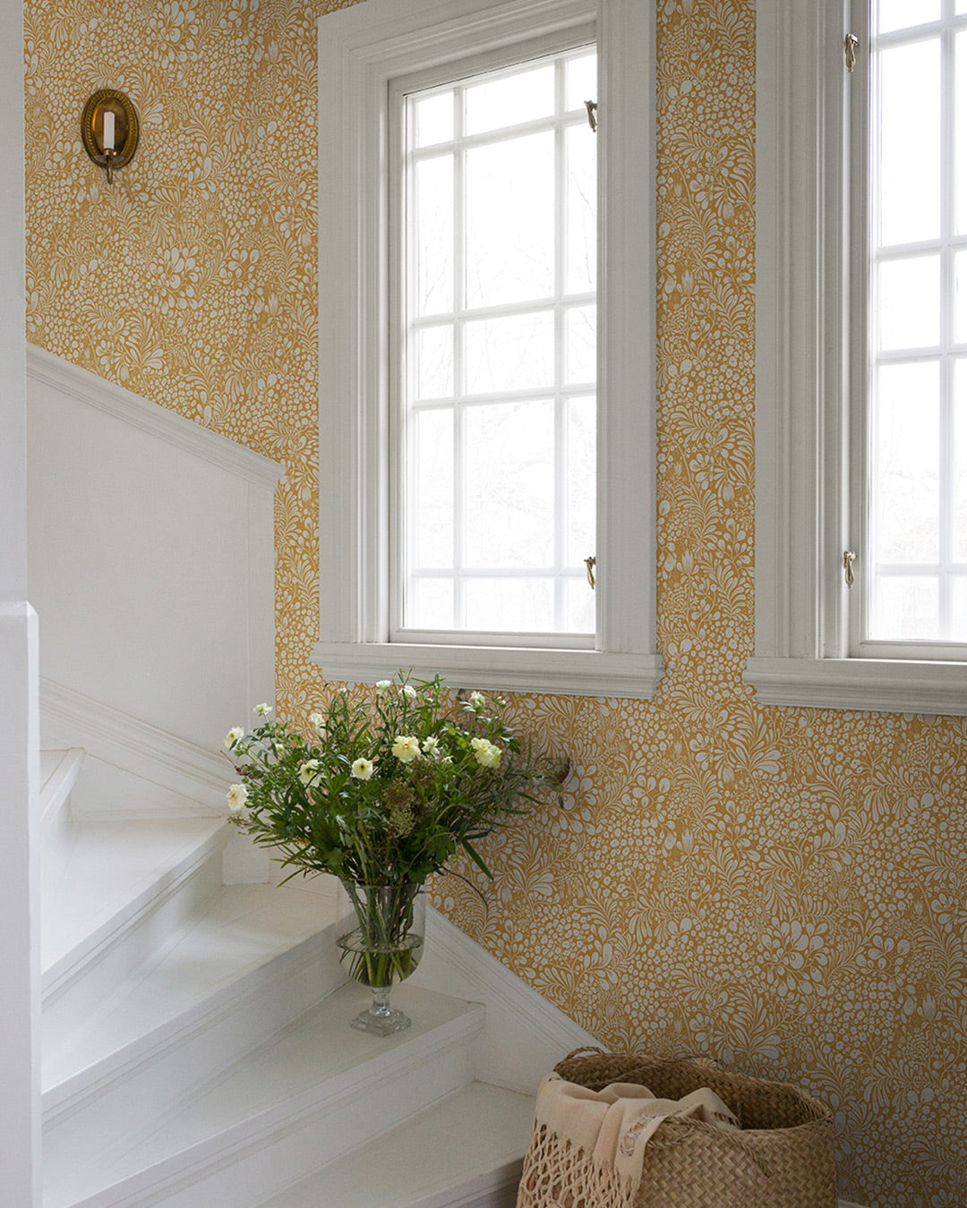 Vackra tapeten Siv har ett förtjusande mönster som inspirerats av b.la sommarblommor. Detta heltäckande mönster finns i hela tio olika färgställningar där färgpaletten går från milda ljusa pastelltoner till mer dova, djupa kulörer. Tapeten är designad av Lina Schnaufer.