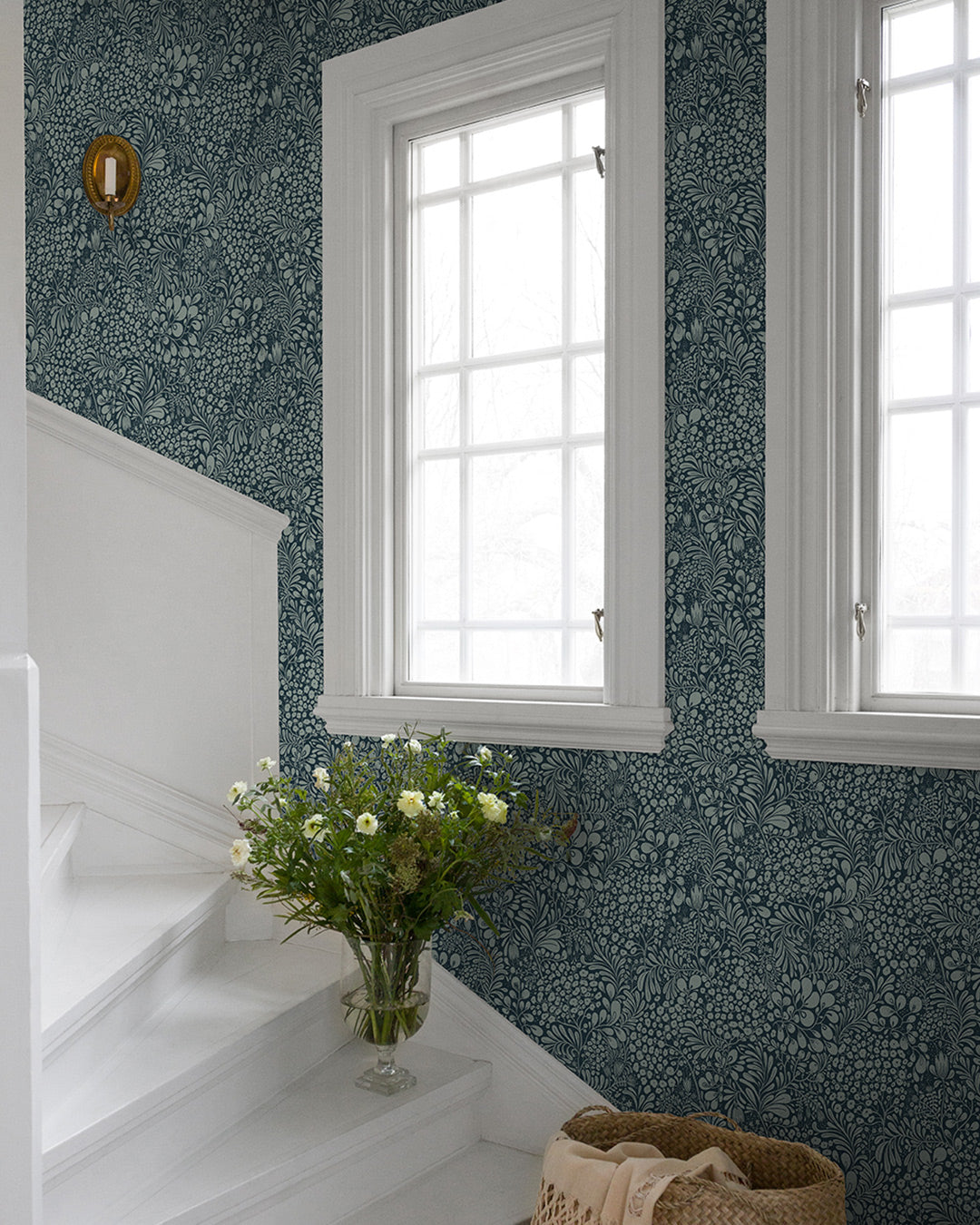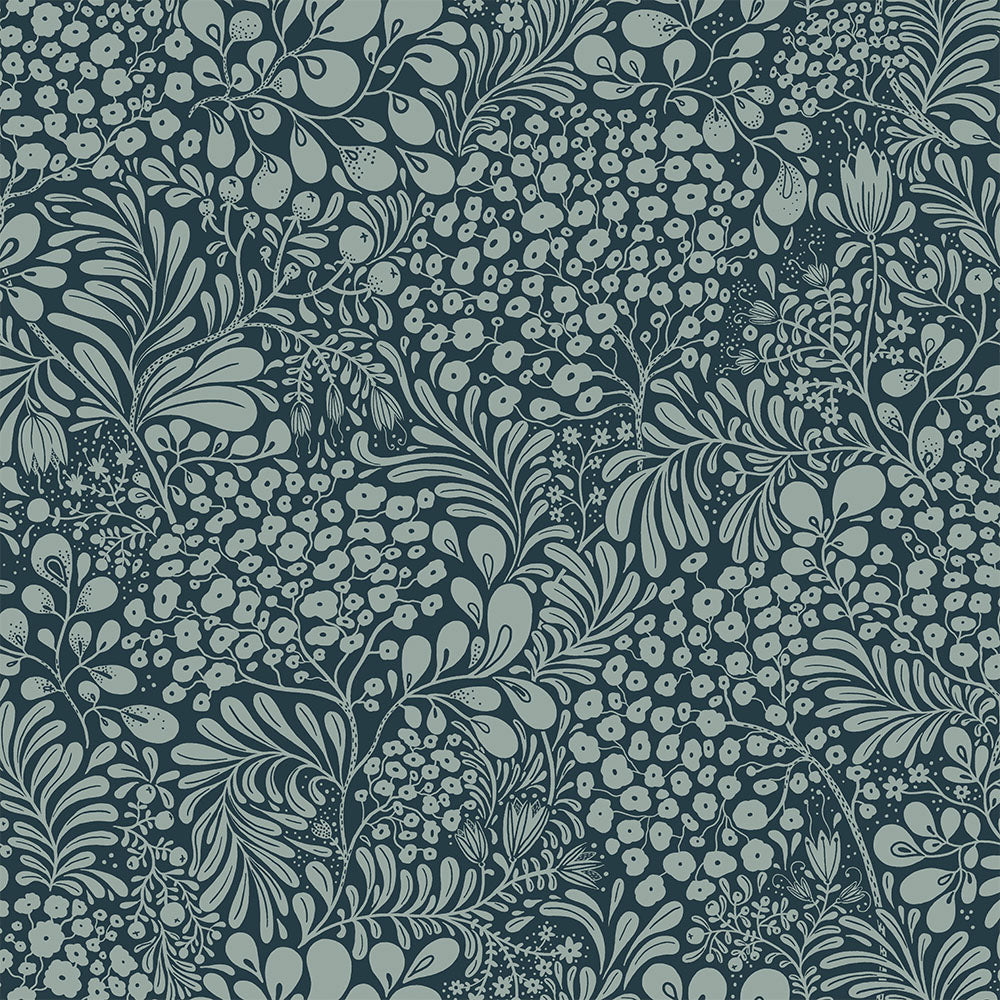 Tapeten Siv med dess vackra blommönster kommer i tio olika färgställningar och är skapad av formgivaren Lina Schnaufer. Denna tapet har en mörkblå botten som möts av vackra blommor och blad i grått. En tapet som är lika fin i sommartorpet som i storstads lägenheten.