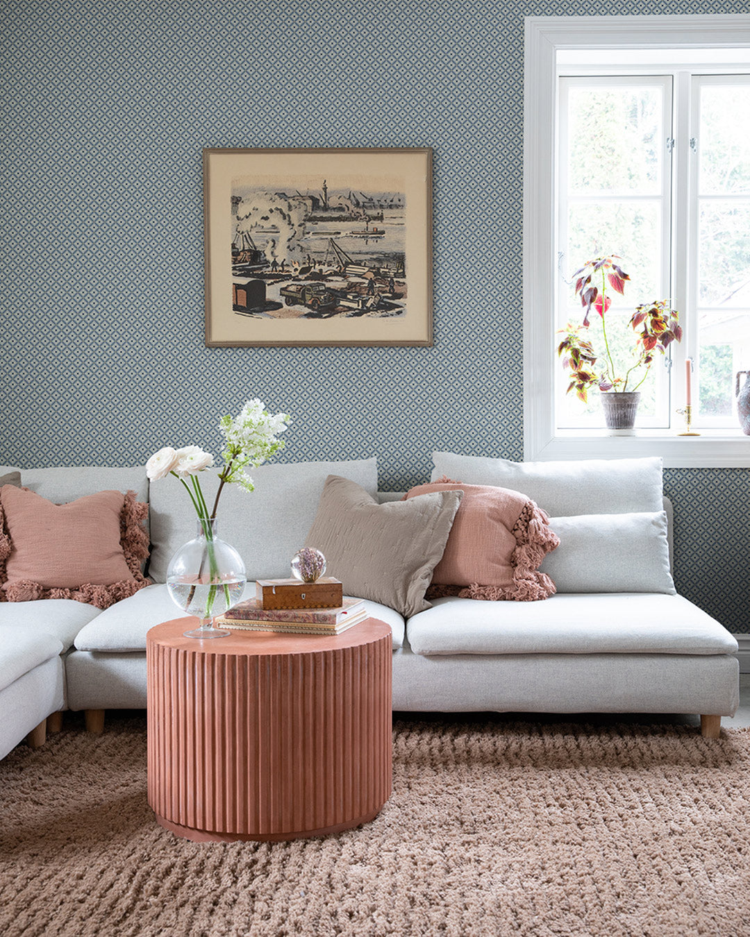 Ett diskret rutmönster i vitt, grått och silver på en blå botten. Skärhamn är ett klassiskt enklare mönster som skapar hemtrevnad och passar i alla rum. Mönstret är skapat av designern Hanna Wendelbo och ingår i den omtyckta kollektionen Apelviken.