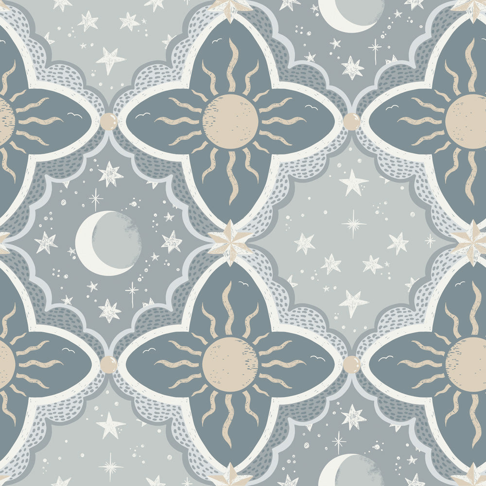 Barntapet Sol & Måne i blågrå färgställning bidrar till ett behagligt pch tryggt barnrum. Strålande solar i beige, tindrande stjärnor i vitt och måne som går från skärva till full skapar ett lekfullt mönster för barn i alla åldrar. Här pågår ett vackert samspel mellan dag och natt.