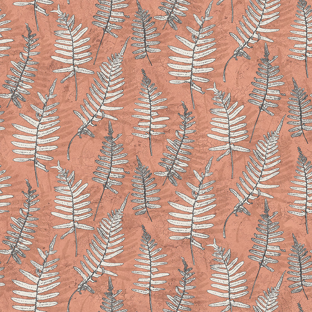 Vacker handmålad terracotta tapet med vita blad. Du ser Stensötan slänga en skugga mot en marmorerad botten, vilket i sin tur skapar rätt mängd av komplexitet och djup till designen. Mönstret är från Hanna Wendelbos kollektion "Skogsgläntan" som hämtar inspiration från en svensk fridfull natur.