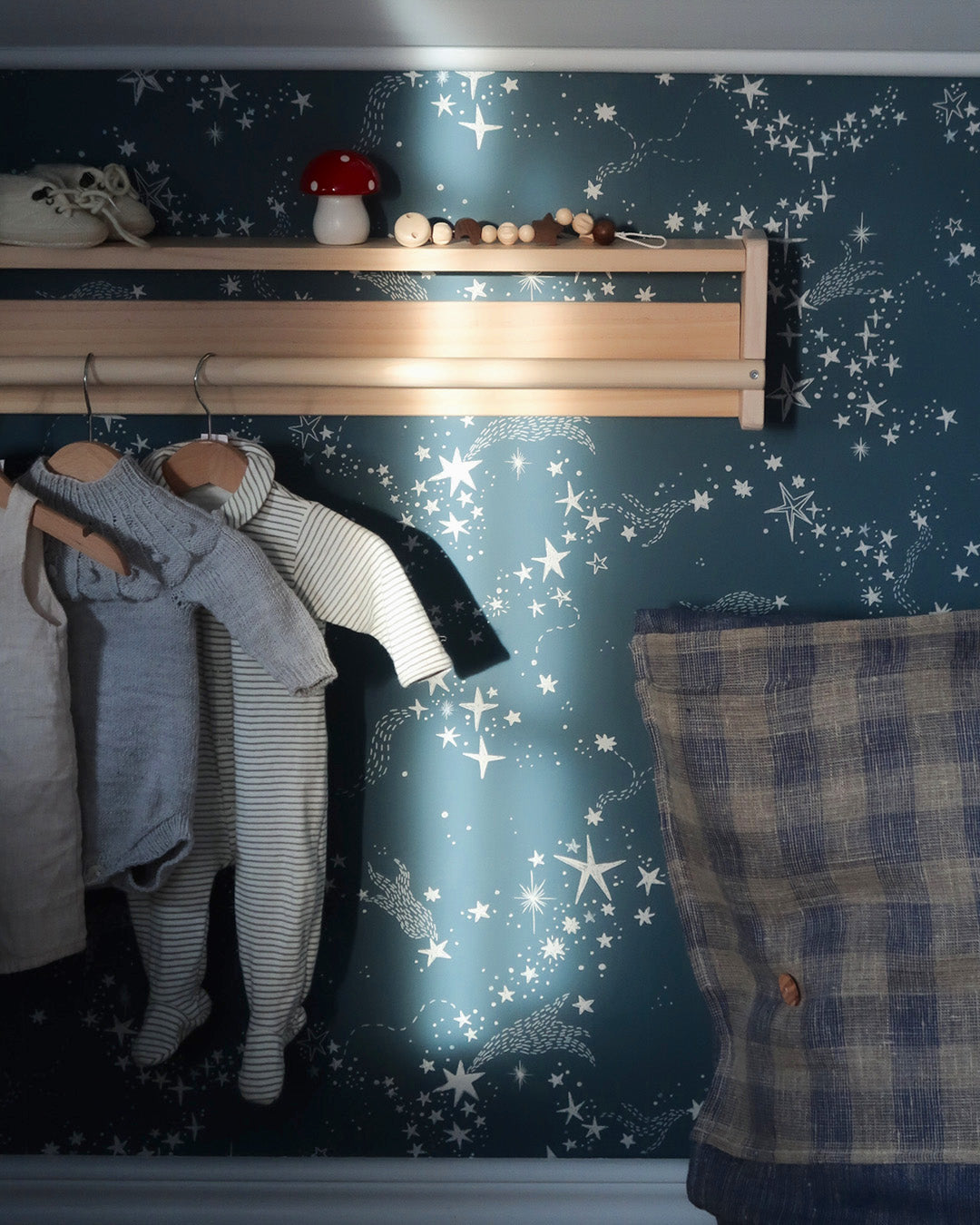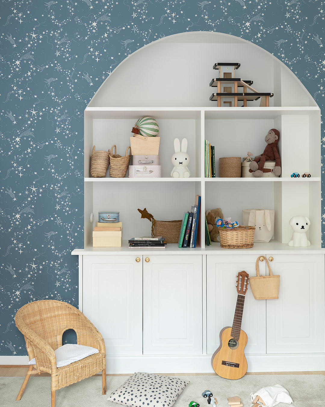 En natthimmel klar full med stjärnor. Det faller en där, det tindrar extra starkt av en här, allt kan hända i stjärnornas värld. Låt dem stråla med sitt vackra sken på barnrummets väggar i denna mjuka färgställning av behagligt blågrått och vitt.