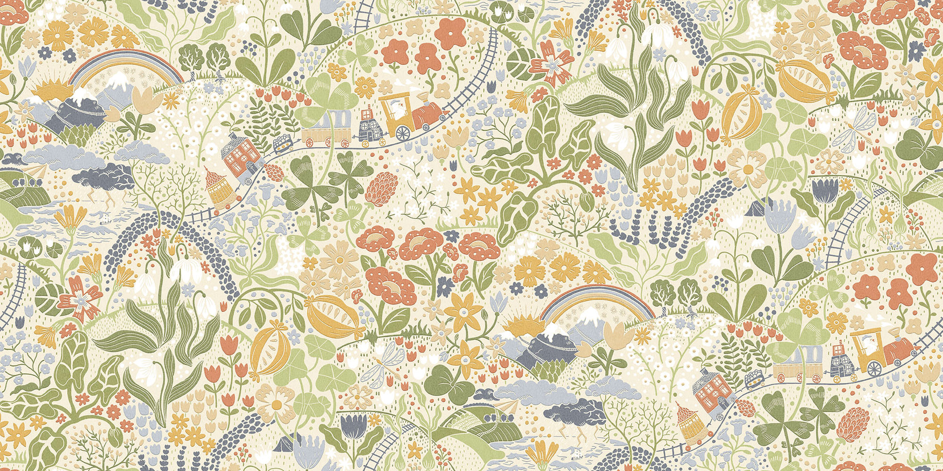 I barntapeten Tåget med beige botten far tåget över vida landskap och höga snöklädda berg. Färden är lång och från tågets fönster kan du upptäcka mycket längs resan. Det detaljrika mönstret i nyanser av grönt, blått, tegelrött, vitt och gult skapar en hel värld på väggen där du och ditt barn får följa med på äventyret.