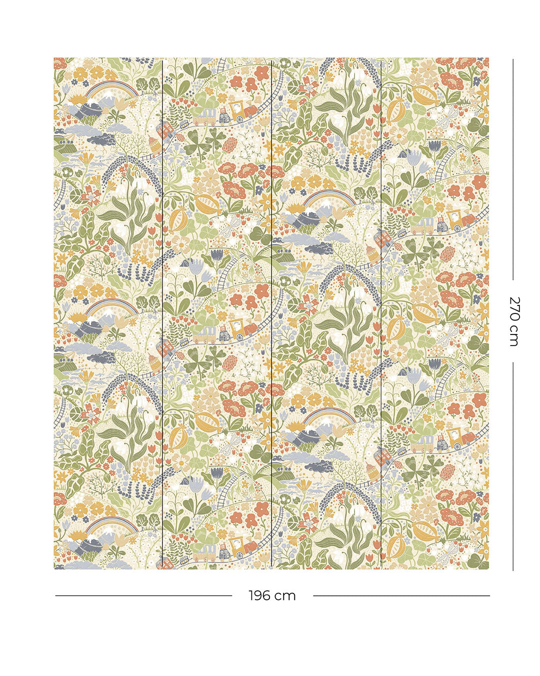 Denna tapet är en fototapet med fasta mått där en rulle innehåller 4 paneler med det totala måttet: 2,7 m x 1,96 m.