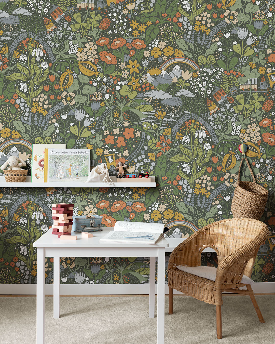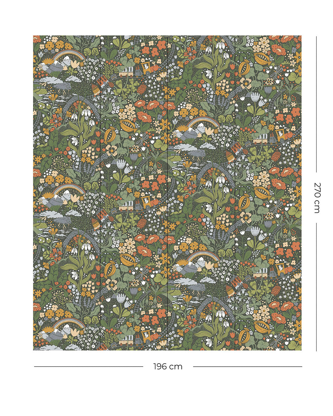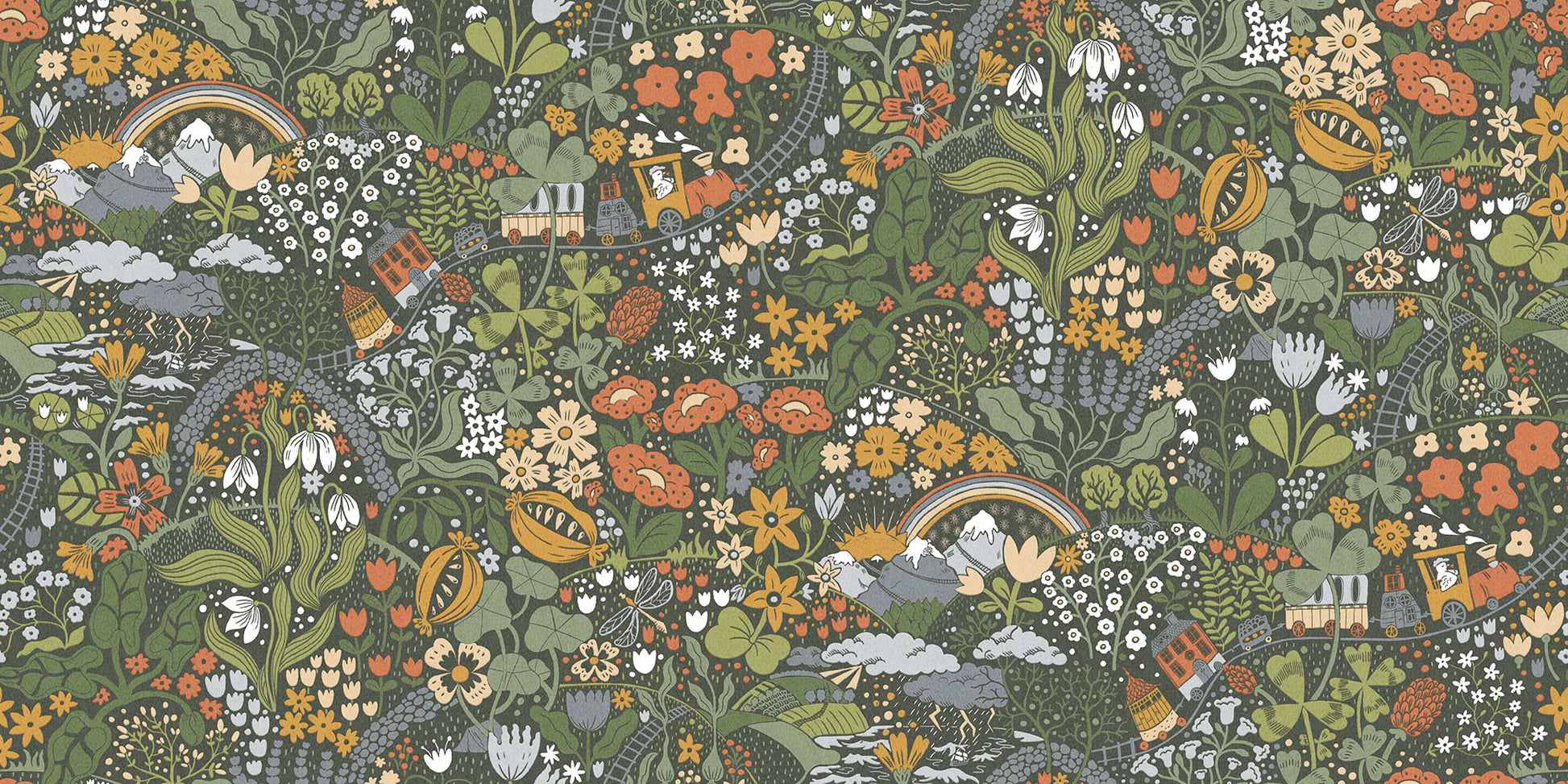 Denna tapet är en fototapet med fasta mått där en rulle innehåller 4 paneler med det totala måttet: 2,7 m x 1,96 m. I barntapeten Tåget på mörkgrå botten färdas det lilla tåget genom ombyttliga landskap. Långsamt upp för snöklädda kullar men snabbt ner i djupa dalar. Här växer främmande växter och åskan mullrar över havet. Ett äventyr som med sin detaljrikedom i nyanser av grönt, gråbått, rött, beige och mörkgult fortsätter att fascinera.