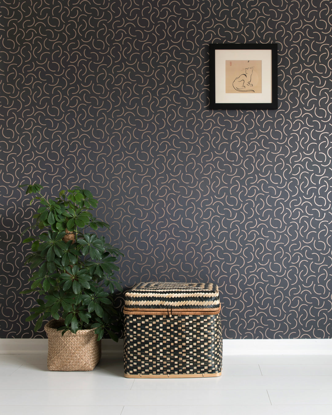 Med svarta tapeten Tarn Reflection får ditt hem en rejäl uppdatering. Tapeten har ett spännande motiv som skapar ett intresse och djup. De handritande geometriska halvcirklarna går i en kopparfärgad nyans som bidrar till en stilfullhet i rummet. Tapeten finns i sex olika färgställningar.