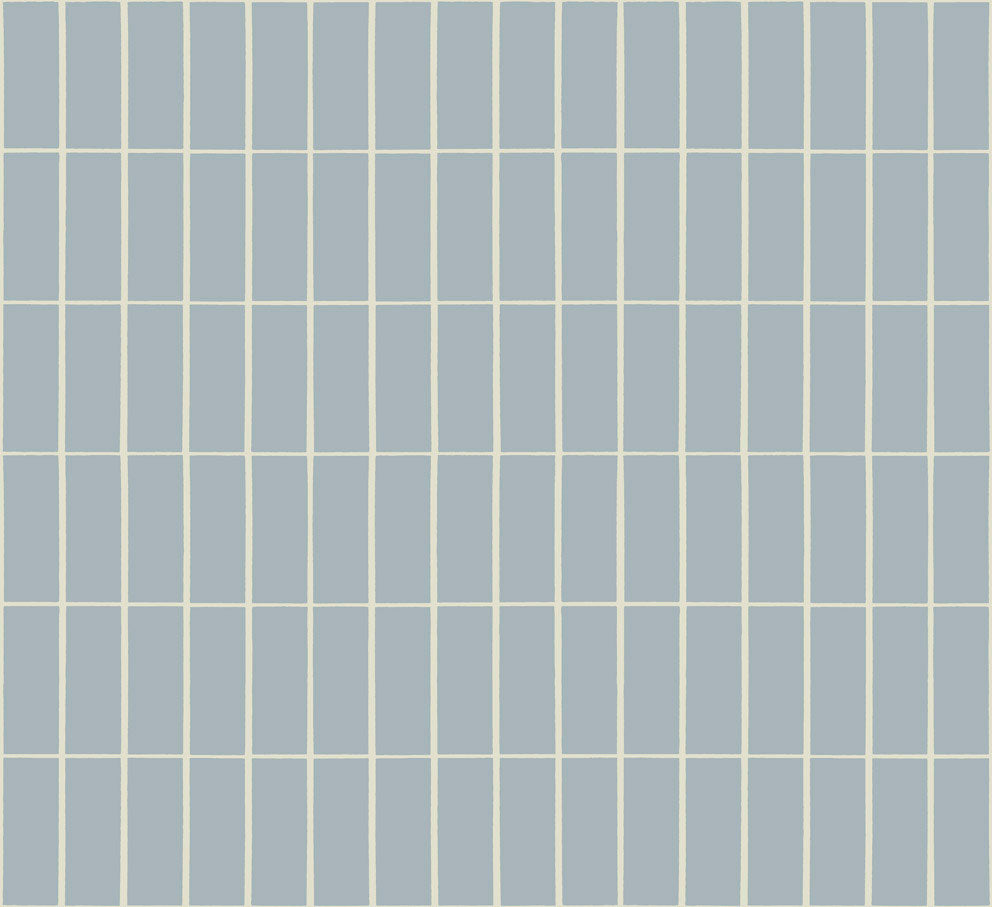Skönhet i det enkla. Ljusblå tapet med rektanglar staplade på varandra skapar i sin enkelhet ett behagligt geometriskt mönster. Namnet Tiiliskivi betyder tegel på finska och mönstret skapades av Marimekkos grundare Armi Ratia 1952 med temat skönhet i det enkla