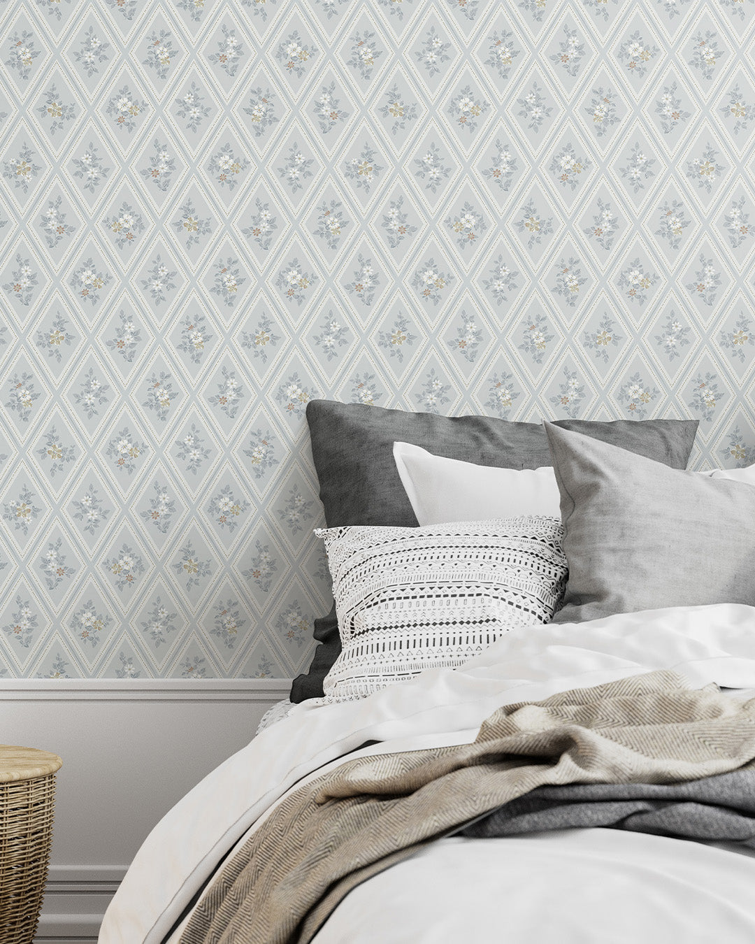 Behagligt i blått med inslag av gråa toner genomsyrar denna rara tapet Trellis. I mönstret ser du små buketter, lika varandra men ändå olika vilket skapar ett härligt dynamiskt intryck i rummet.