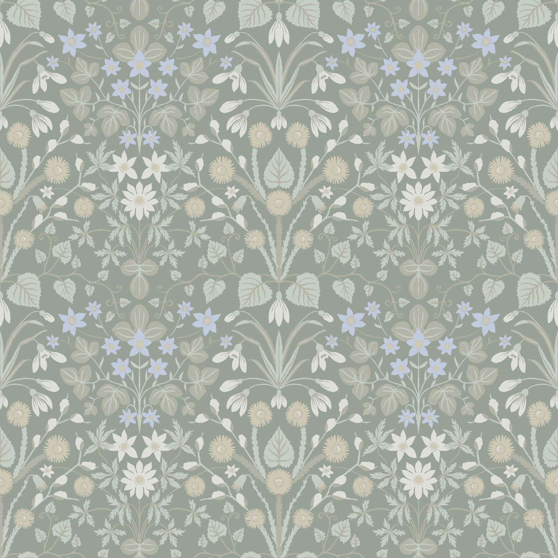 Välkomnas av ett hem i harmonisk grönska i svala, friska toner. Tapeten vårblommor är ett levande och symmetriskt mönster som får vårkänslorna att spritta i kroppen. Vitt från vitsippa, vide och snödroppe får sällskap av tussilago och blåsippa i dämpade toner av blått och ljusgult.