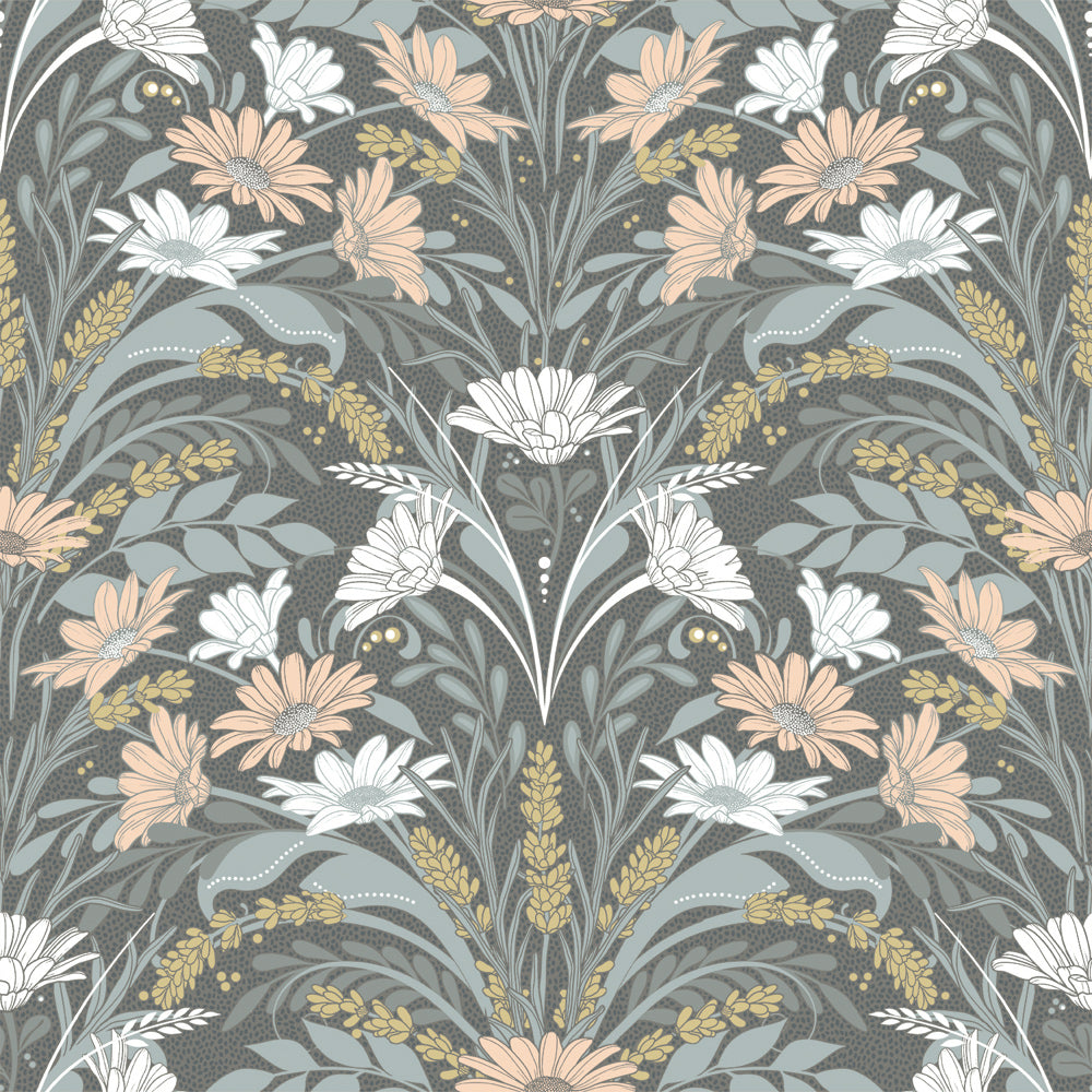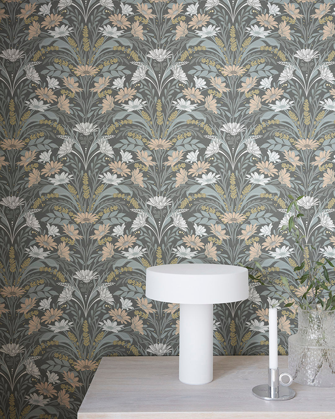 Brun tapet med blommor i vitt, ljus aprikos och grått som alla går i jordnära toner. Prästkrage och lavendel omfamnas av ett svalt bladverk i mönstret Värmdö. Bladverket i sin tur skapar ett ljuvligt skådespel där de lummiga delarna lyfter upp de omkringliggande blommorna till nya nivåer. Värmdö finns i sex färgställningar.