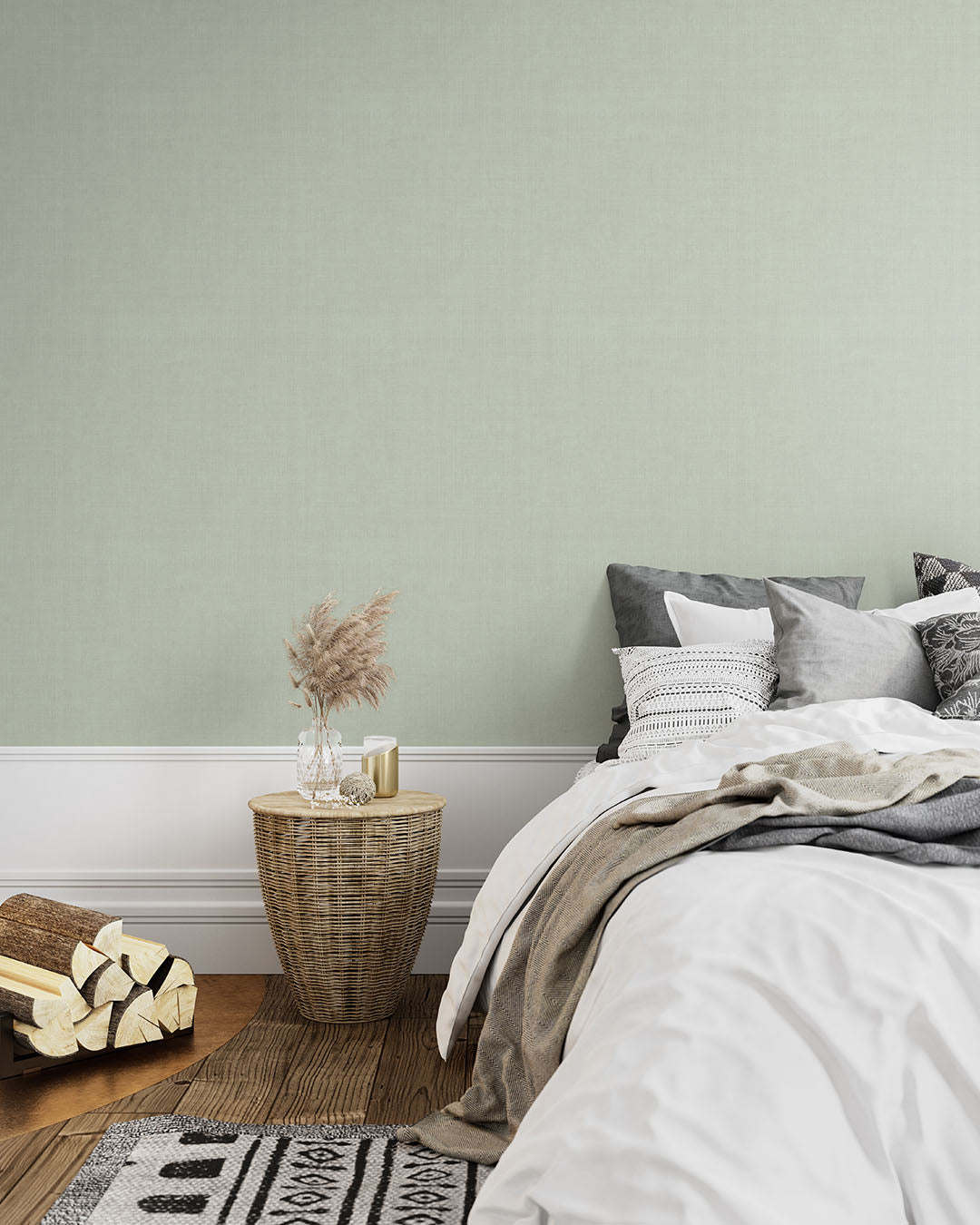 En enfärgad ljus gröngrå tapet med en lätt taktil textilstruktur tillför en sofistikerad klädd känsla i rummet. Tapeten Jute passar i hela rum likaväl som komplement för en fondvägg.