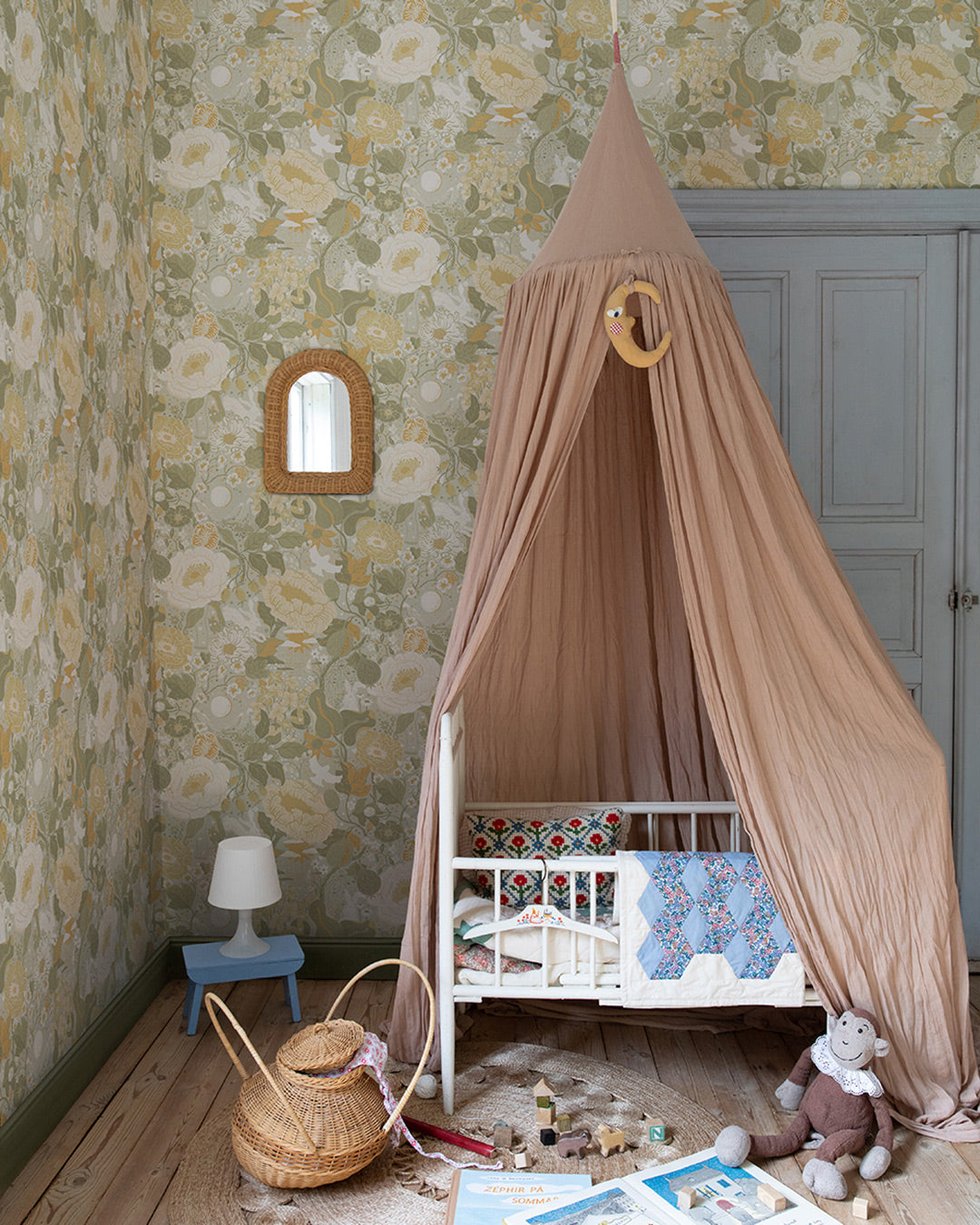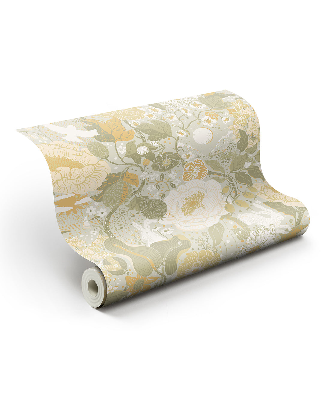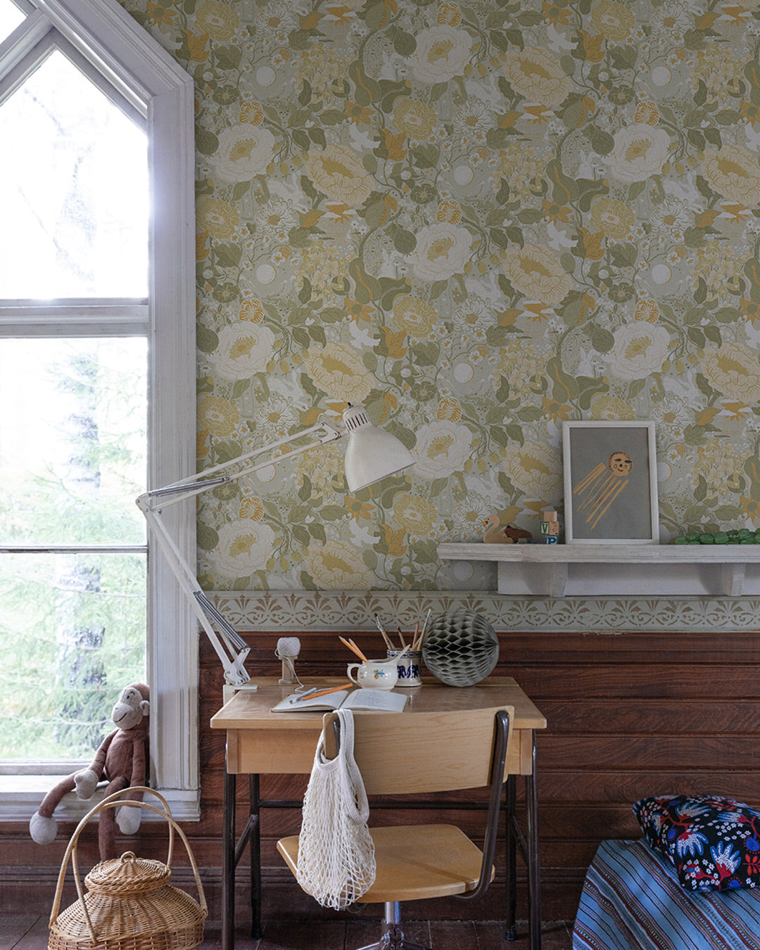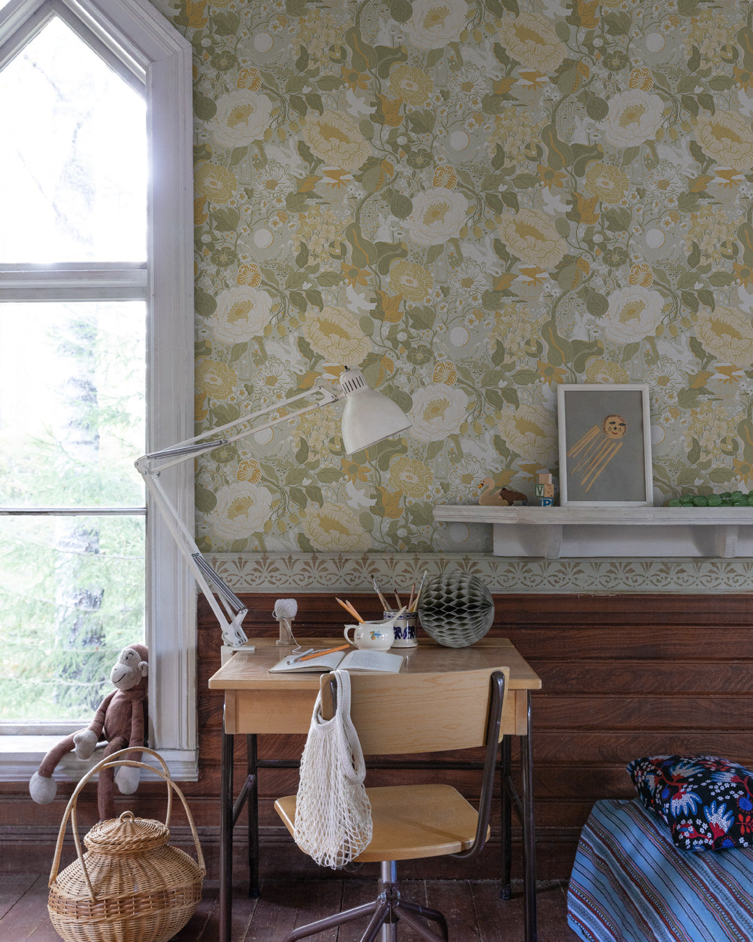 Mönstret i barntapet Växa kombinerar det vackra med det lekfulla. Slingrande växtlighet i form av pampiga rosor, väldoftande kaprifoler och söta körsbärsblommor får sällskap av bergstoppar i månsken, solnedgång över hav, små ägg i fågelbo och skuttande harar. Med Växa får du ett mysigt och sagolikt barnrum där den dämpade färgställningen i nyanser av grått, grönt och gult ger rummet ett behagligt intryck.
