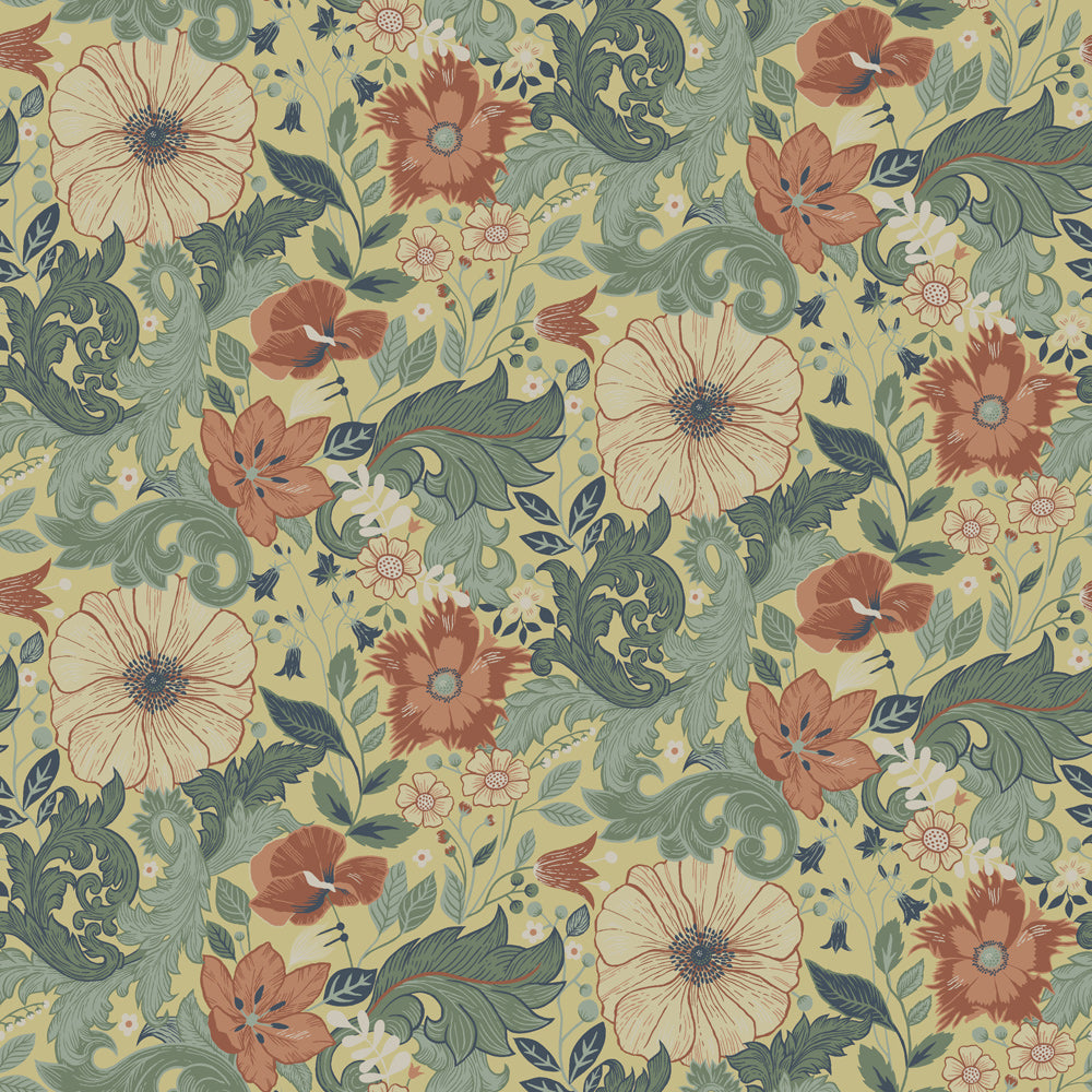 Det är lummigt, romantiskt och stilsäkert. Tapeten Victor med sin gulgröna botten ger en försmak av sensommarens alla trevligheter. Med Victor får du ett ombonat och romantiskt rum som bidrar till ren glädje. Tapeten finns i sex olika färgställningar och är skapad av Hanna Wendelbo.