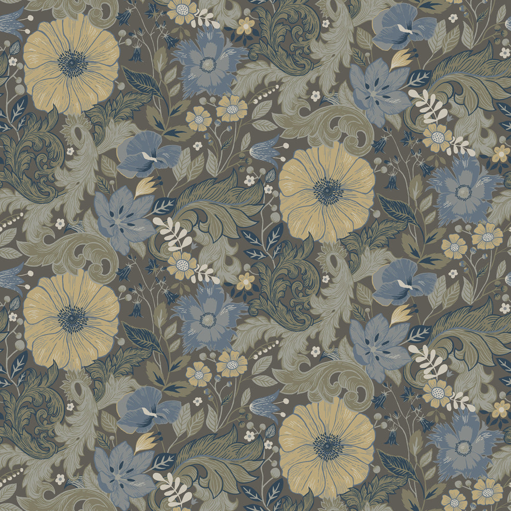 Tapeten Victor, känslan av att tränga sig igenom en alltför lummig trädgård och måste med händerna ta bort all vacker grönska framför ögonen för att ta sig fram. Victor skapar en varm och ombonad känsla. Här med en brun botten med blommor i beige och blått och blad i olika gröna nyanser. Tapeten finns i sex olika färgställningar och är skapad av Hanna Wendelbo.