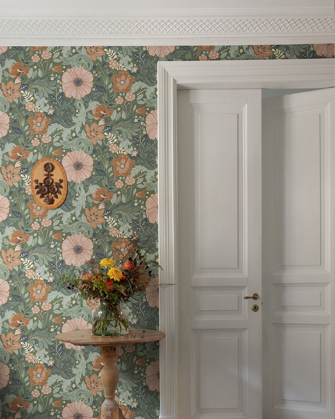 Tapeten Victoria tar för sig och ger väggen en härlig inbäddad grönska med vacker vallmo och bladverk. Storblommig och prunkande med sin fantastiska färgkombination förgrenar Victoria ren glädje. Victoria finns i fyra färgställningar. Tapeten är skapad av designern Hanna Wendelbo.