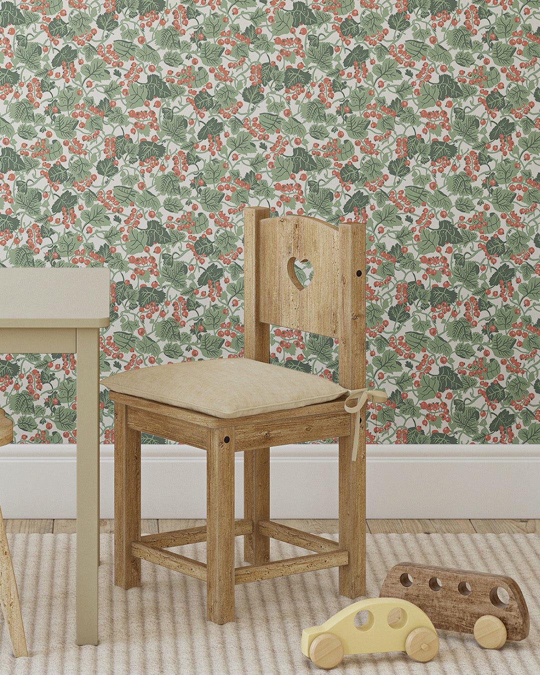 Klä in hemmet i en enda stor vinbärsskog och skapa en härlig stämning. De söta eller kanske sura små röda bären hänger på de gröna grenarna och är redo att skördas. Vinbärsplock kommer i två färgställningar, här med en vit botten och ett mönster i grönt och rött.