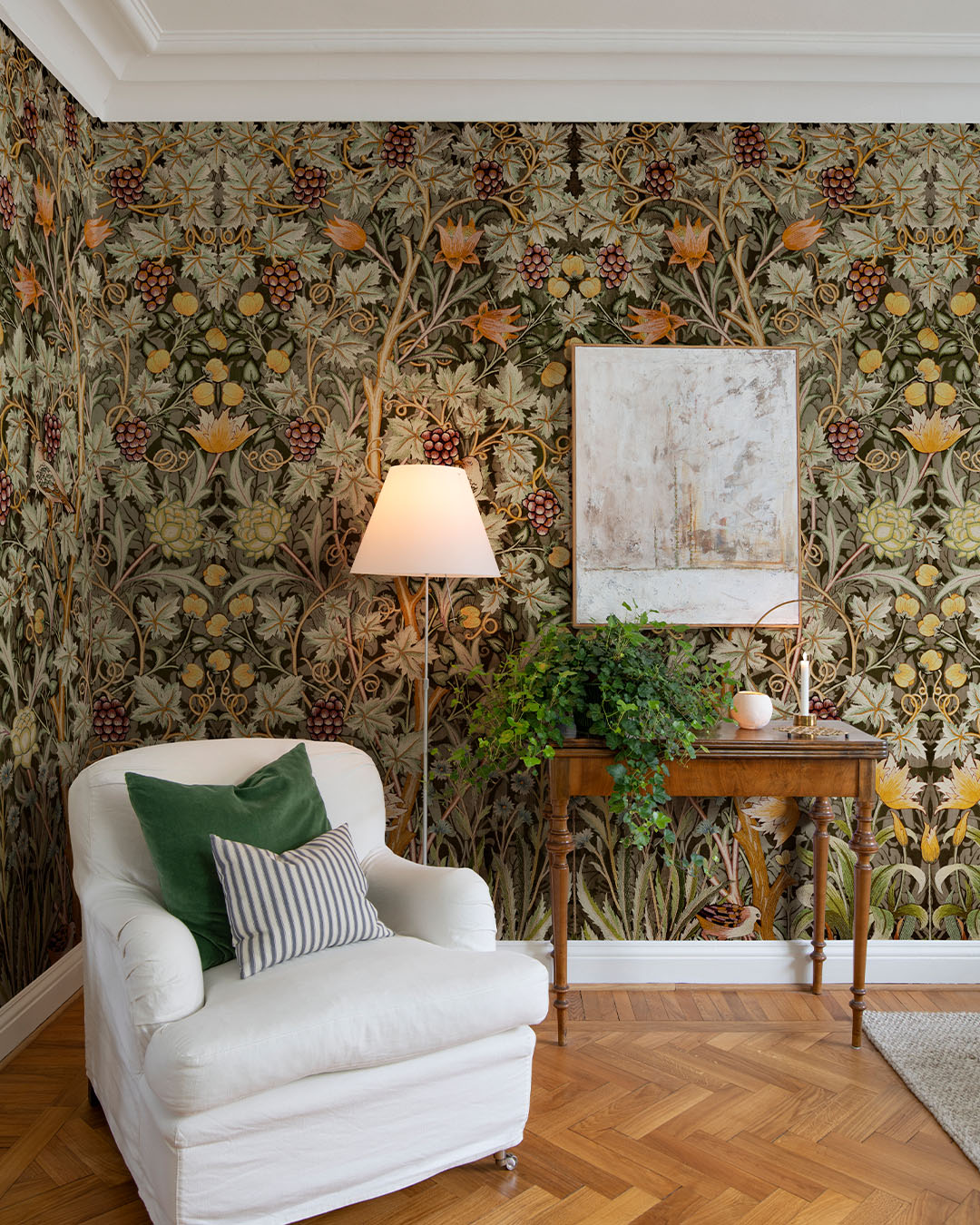 I väggmotivet Vine Embroidery klättrar vinrakorna högre och högre upp. Ett mönster skapat 1896 som ett storskaligt broderi föreställande ett tätt snår med vacker växtlighet. Blommor och blad, grenar och kvistar skapar en ogenomtränglig vegetation där bara fåglar kan ta sig in och hitta snårets små skatter i nyanser av brunt, orange, grönt, plommon och gult. Denna tapet är en fototapet med fasta mått där en rulle innehåller 4 paneler med måtten: 2,7 m x 0,49 m per panel. Pris per rulle (4 paneler): 2385 SEK.