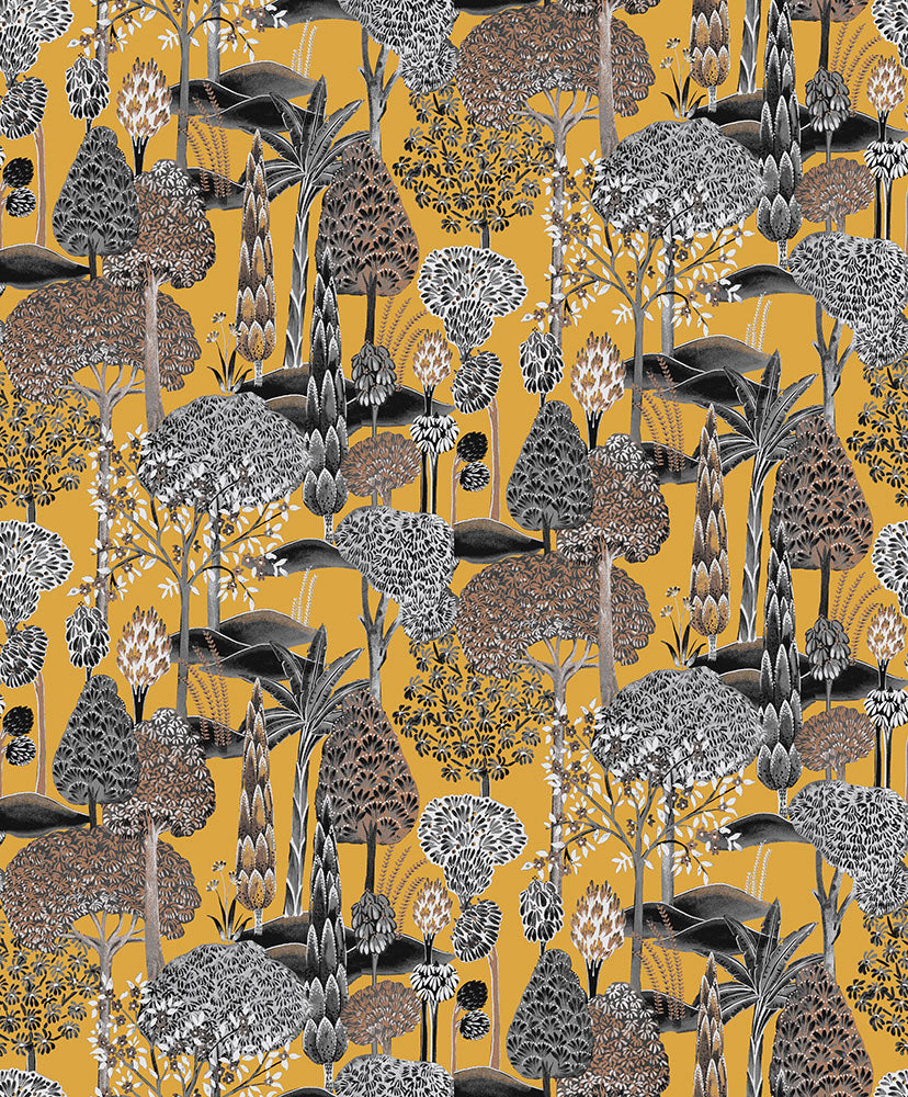 Träd, blommor och frodiga blad inspirerat från indiska miniatyrmålningar som utstrålar kraftfull naturenergi. Den karaktäristiskt gula bottenfärgen i dämpad nyans ger energi och liv åt hemmets väggar och dess omgivning. Tapeten passar lika fint i hallen som i husets mer sociala ytor.
