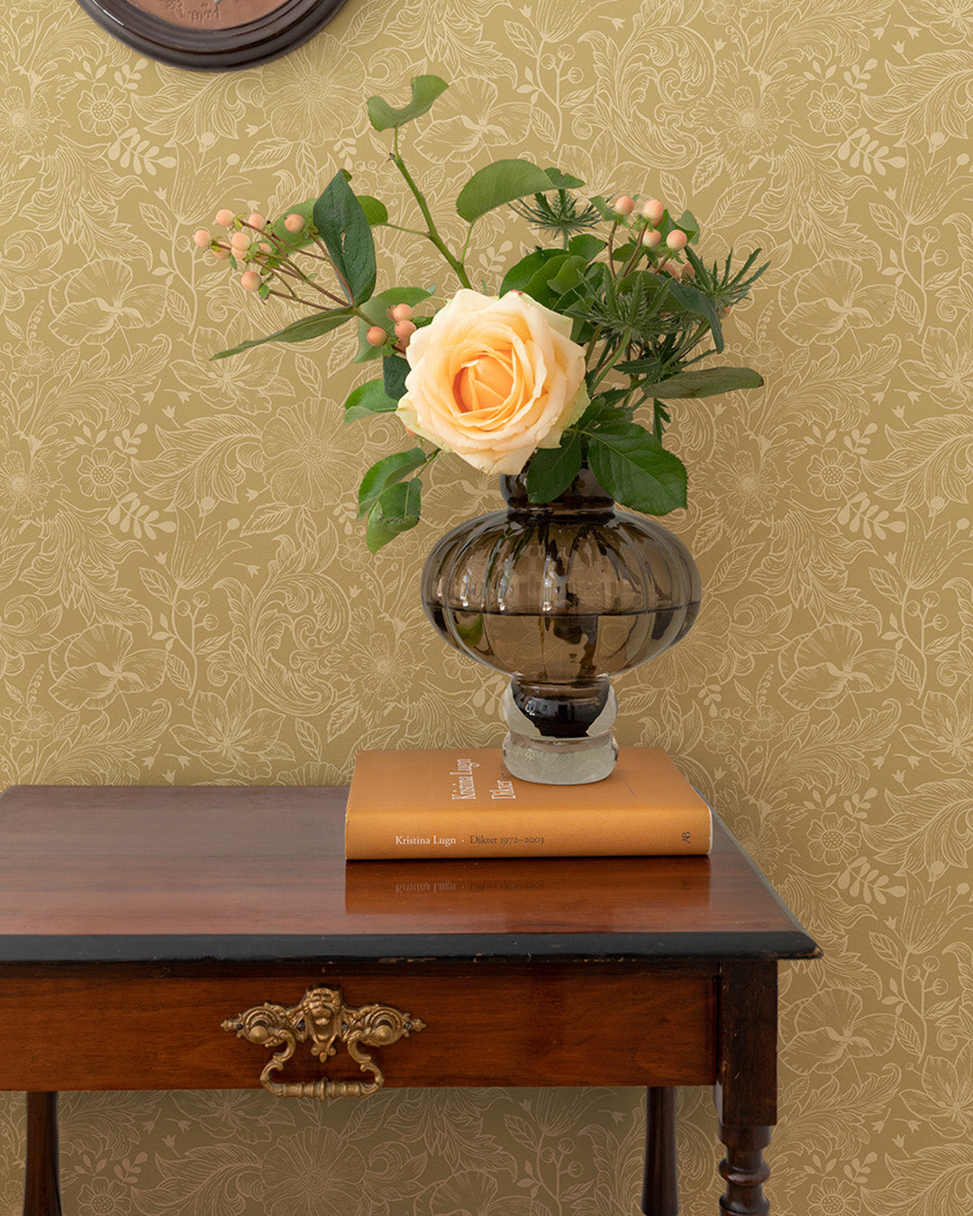 Denna gula dröm till tapet kan förvandla vilket rum som helst till en romantisk plats. Med sitt heltäckande mönster i svag nyans mot en underbar lejongul botten ger tapeten Wilma en känsla av en vacker solnedgång. Tapeten finns i fem olika färgställningar och är skapad av designern Hanna Wendelbo.