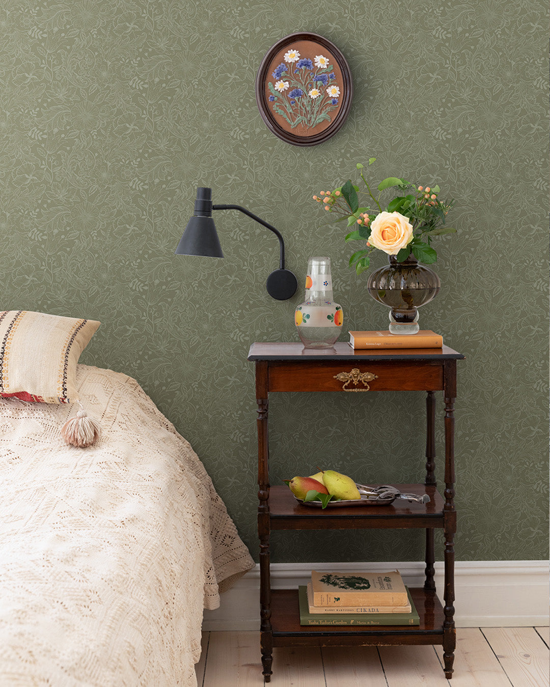 Wilma med sin gröna mjuka ton utger ett lugn i rummet som stillar sinnet. Tapeten pryds av vackra detaljerade konturmönstrade blommor och blad i svag nyans som skapar ett djup i tapeten. Wilma finns i fem unika färgställningar och är skapad av designern Hanna Wendelbo.
