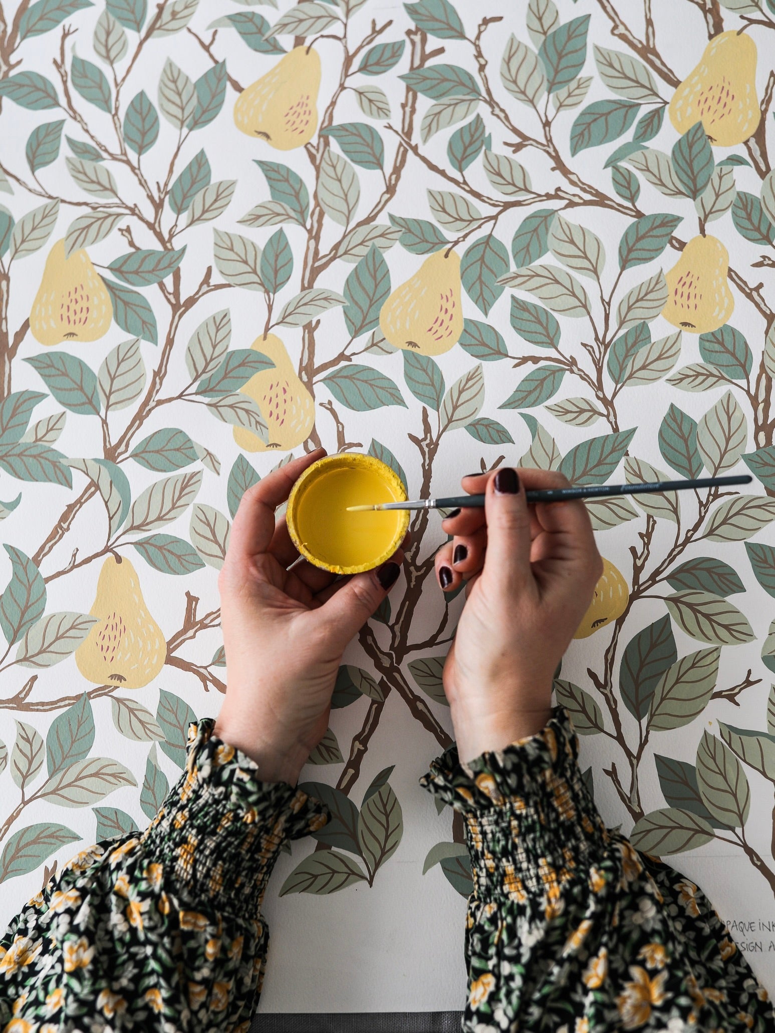Tapeten Pirum är ritad av Hanna Wendelbo och kommer i fem olika färgställningar. Den här tapeten med sitt mönster av vackra gula päron och gröna blad i en beige botten ger rummet en harmonisk känsla. Tapeten är i sitt rätta jag i köket eller matsalen men gör sig fin även i andra utrymmen.